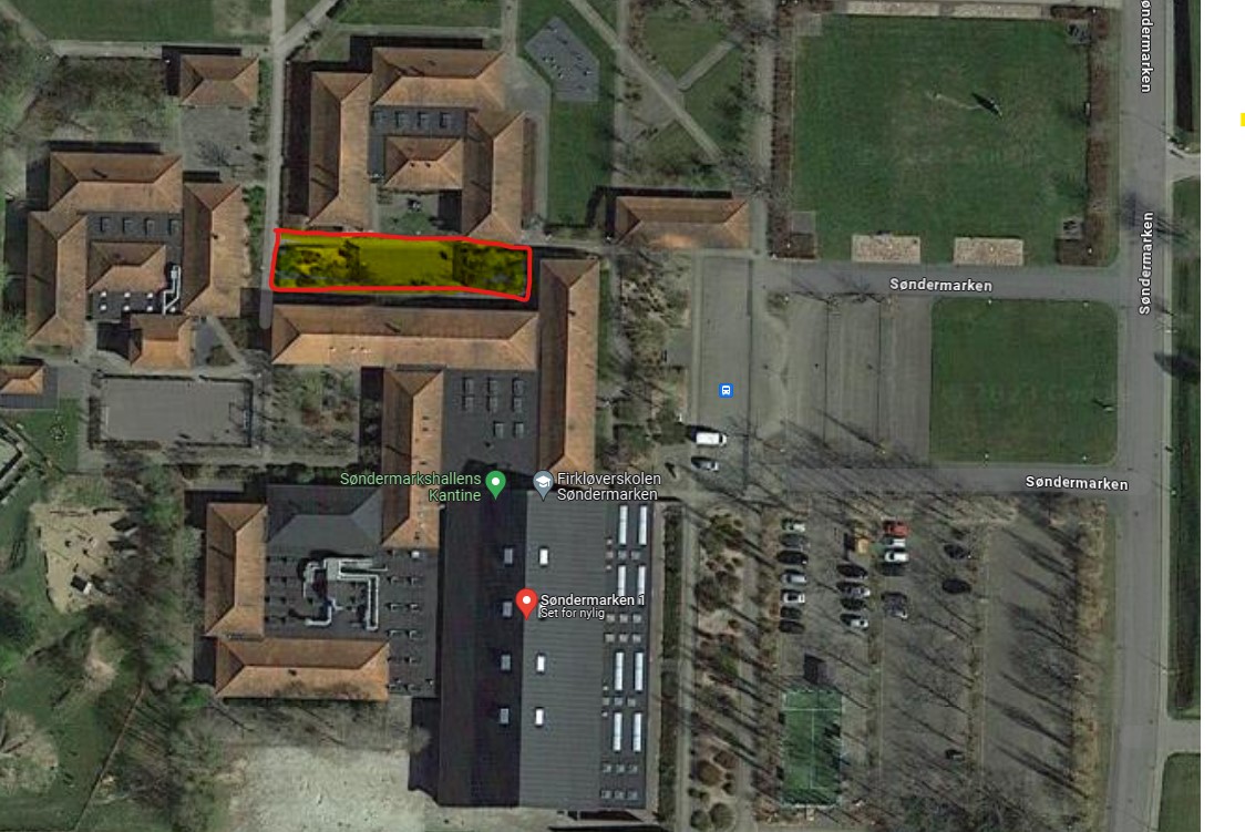 Det er i det markerede område, at det nye ungested bliver etableret. Grafik: Google