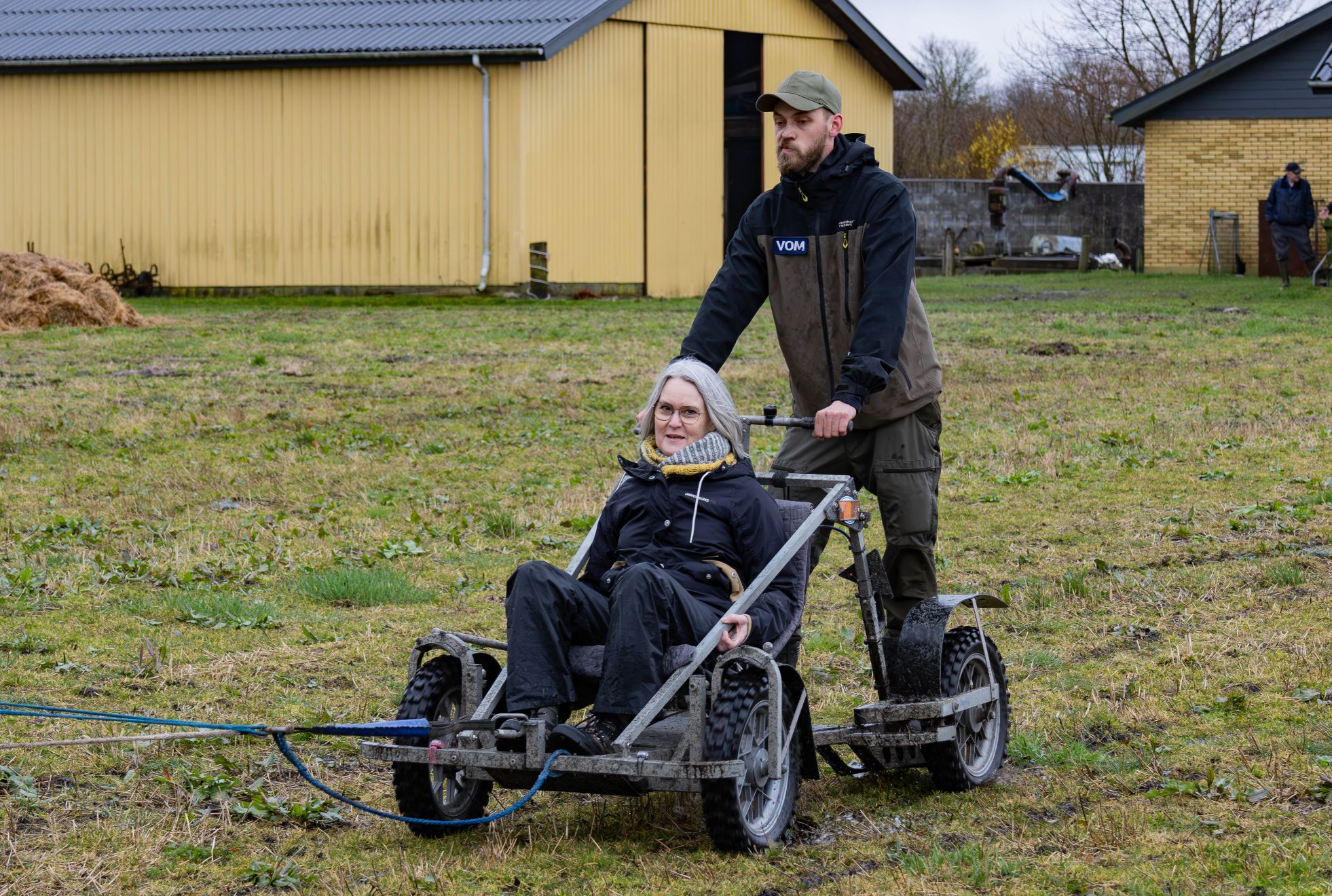 Efter det fine foredrag drog delegationen ud på en mark bag ved skolen, hvor Mikkel og 8 topmotiverede hunde med inciterende ‘ulvehyl’ stod klar til at tage imod eleverne. Når hundene kan se hundeslæden, en 90 kilo tung vogn med hjul, så ved de, at der skal løbes - og så er de oppe at støde, til Mikkel sætter i med startkommandoen. Så falder der ro på flokken – for de elsker simpelthen at drøne afsted med en tung slæde bag sig, gerne med 1-2 passagerer.