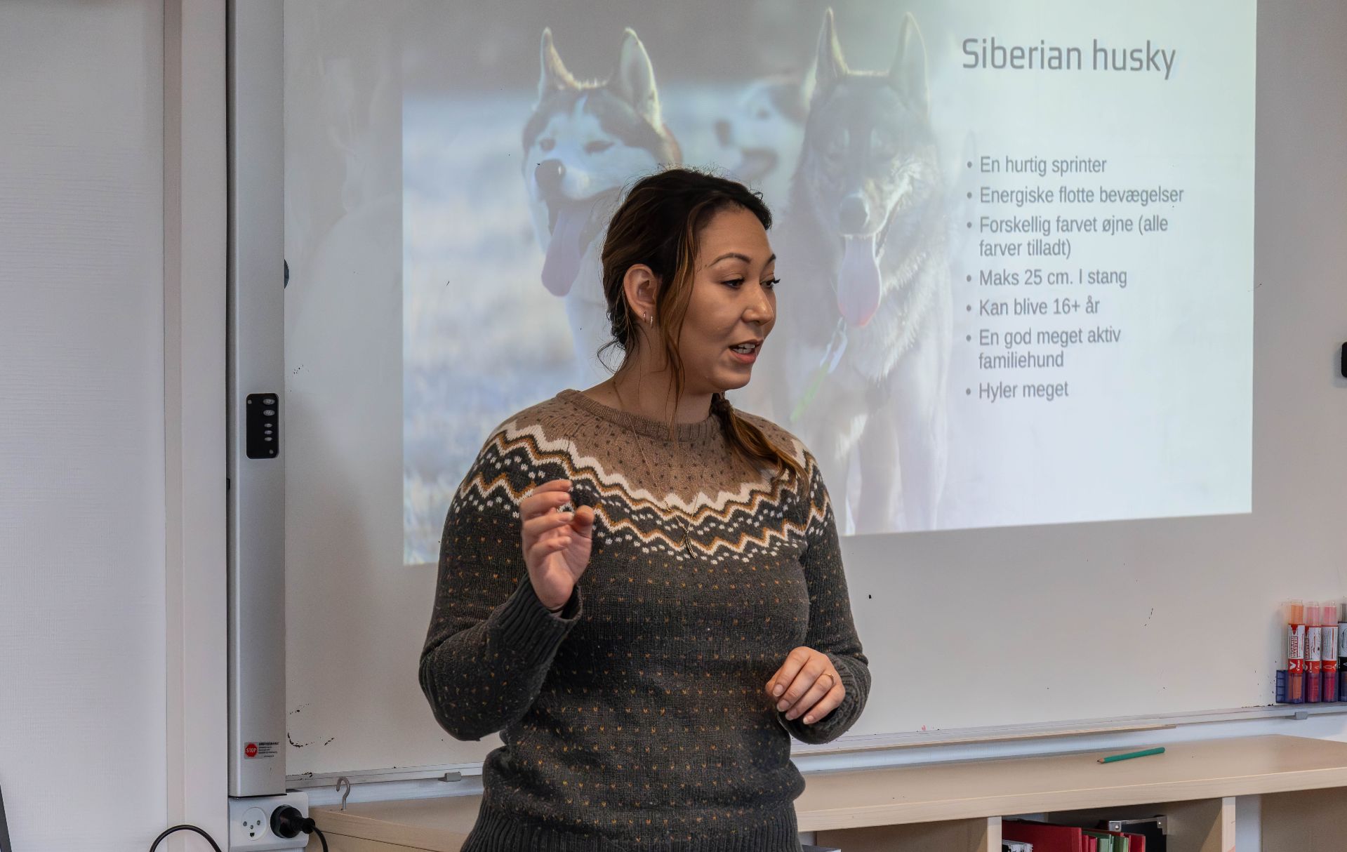Natalie Thybo, der er lærer på friskolen, leverede et fint foredrag og slædehunde. Foto: Jim Hoff
