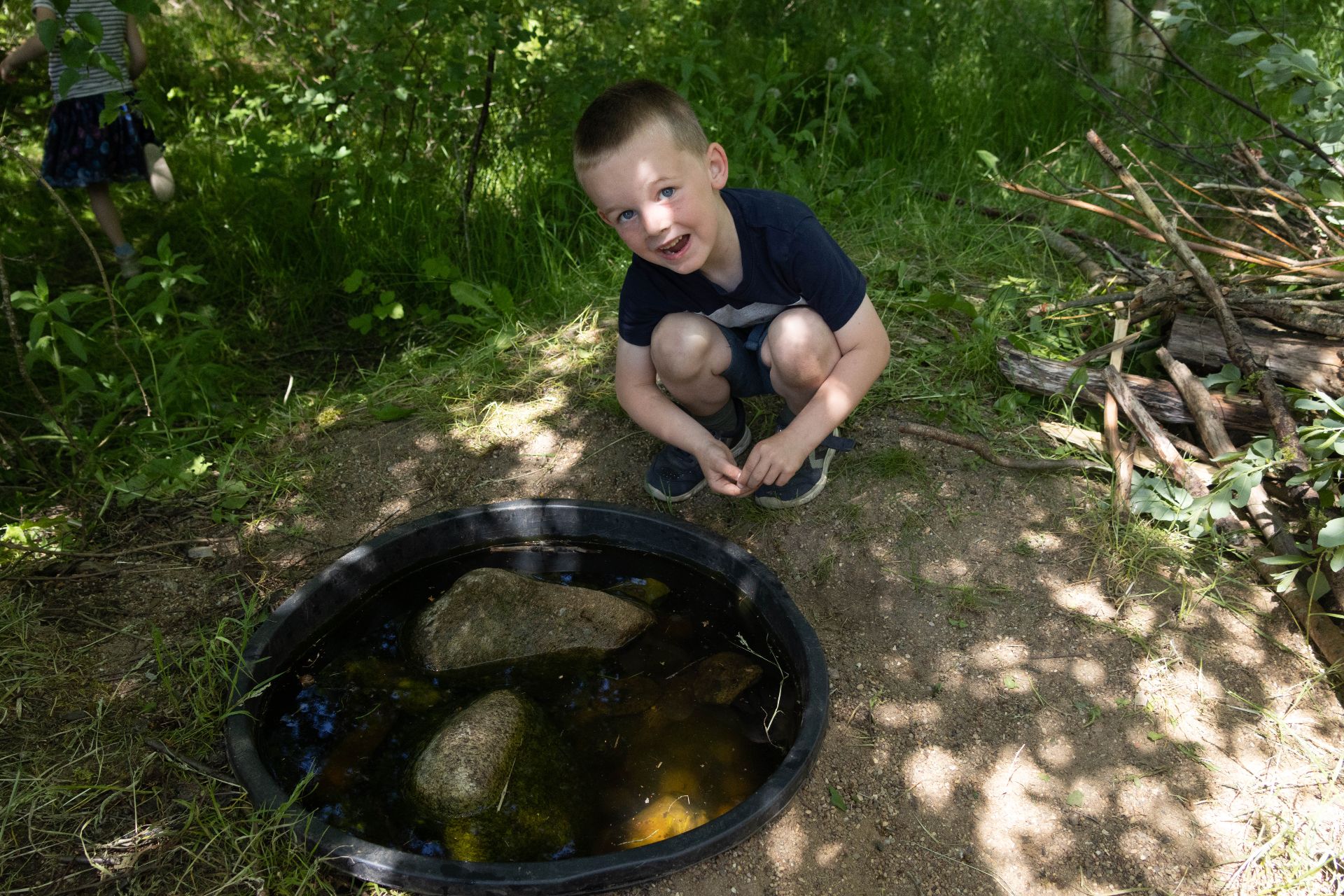 Der foregår også en dynamiks navnegivning af de muntre haletudser og frøer, som har fået residens i det vandhul, etableret i en stor sort murerbalje, som børnene lavede i sidste uge. Måske er de alle hunner, eller er det hanner? Det tager børnene ikke så tungt under navngivningen, hvor det fyger med fantasifulde forslag.