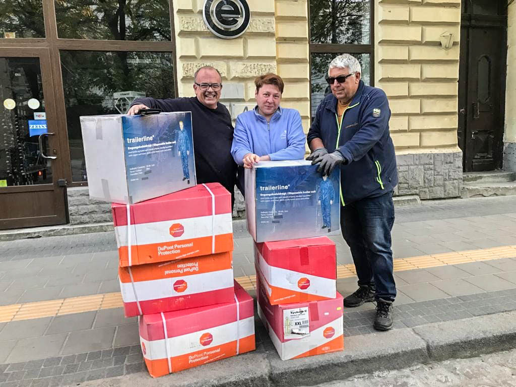 Aflevering af 200 beskyttelsesdragter – 50 kraftige modeller fra Henry Jørgensen i Sejrup og 150 fra Blokhus Rotary klub. Dragterne gik til Bakmut og specifikt til en enhed der kommer fra Kharkiv, men kæmper ved Bakmut. Privatfoto