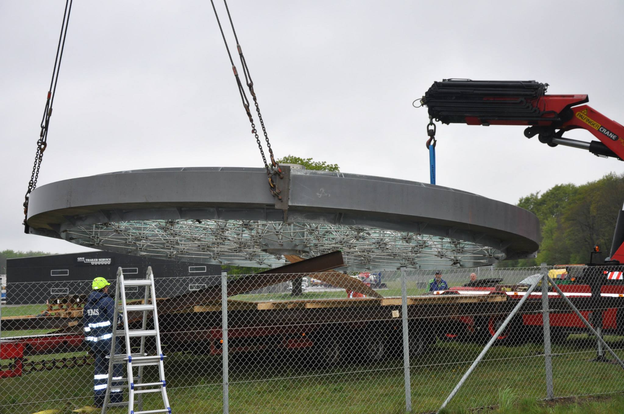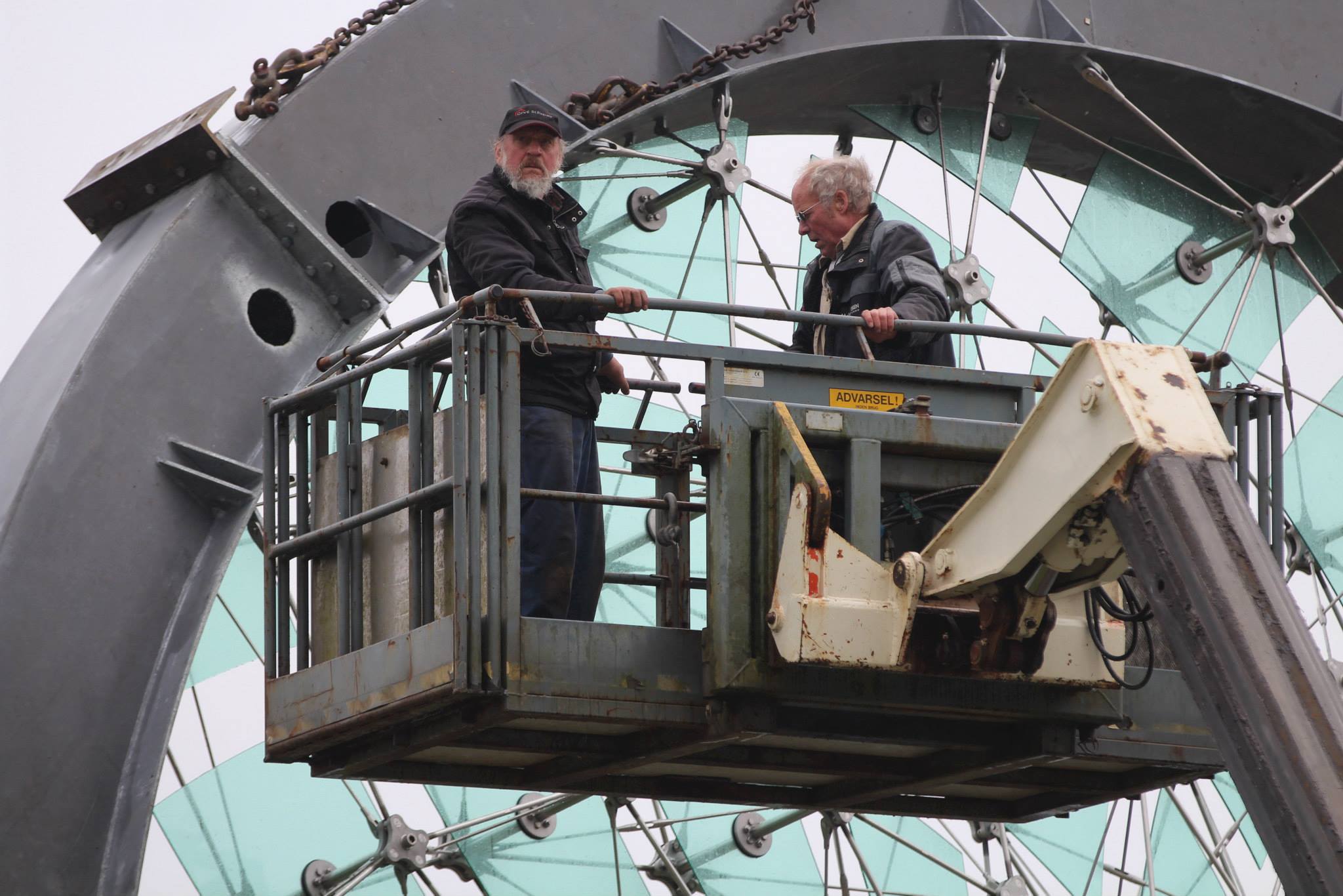 - Det var vel egentlig en slags rejsegilde, da knalddygtige håndværkere, en lettere bekymret kunstner og smånervøse folk fra Skulpturbyen, lørdag eftermiddag i sidste uge med et nærmest synkront "yes" kunne konstatere, at det 14 tons tunge "Solhjul" helt problemfrit klarede vandringen og luftturen fra marken ved Give Sværgods hen over hegnet og kørebanen i Hjortsvangsrundkørslen.