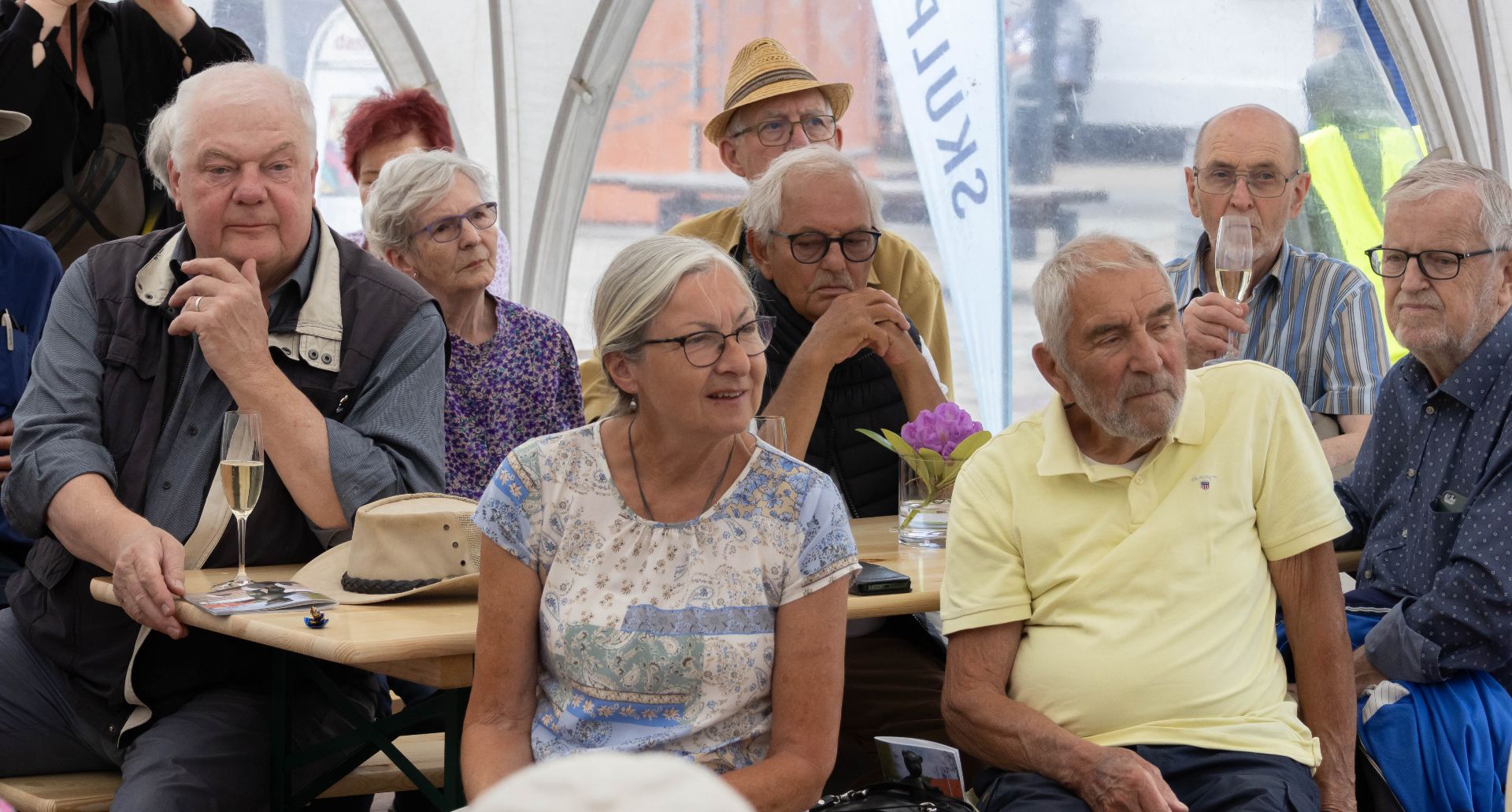 Den blev afholdt om eftermiddagen i teltet på Torvet i forbindelse med dette års Kunst & Skulpturfestival, og vanen tro var der fin opbakning på bænkerækkerne, hvor det modne publikum nød den iskolde hvidvin og de mange pæne ord om ’Danmarks største galleri i det fri’.