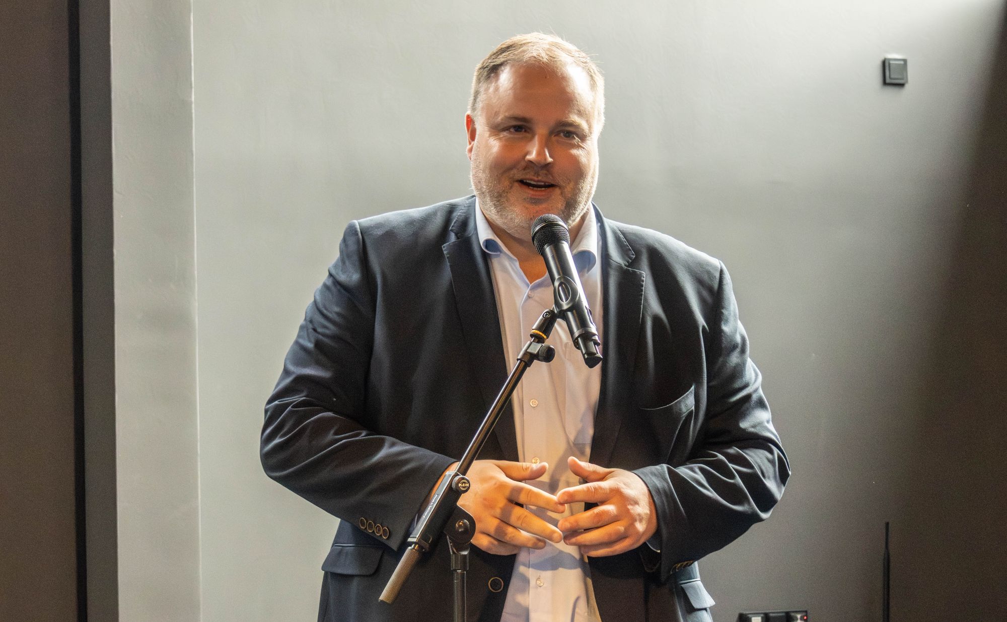 Vejle Kommunes kulturudvalgsformand, Dan Arnløv, sagde både 'tak for kampen' til Skulpturbyens bestyrelse og havde også masser af lovord med til Give om et projekt, de ri den grad har sat Give på landkortet. Foto: Jim Hoff