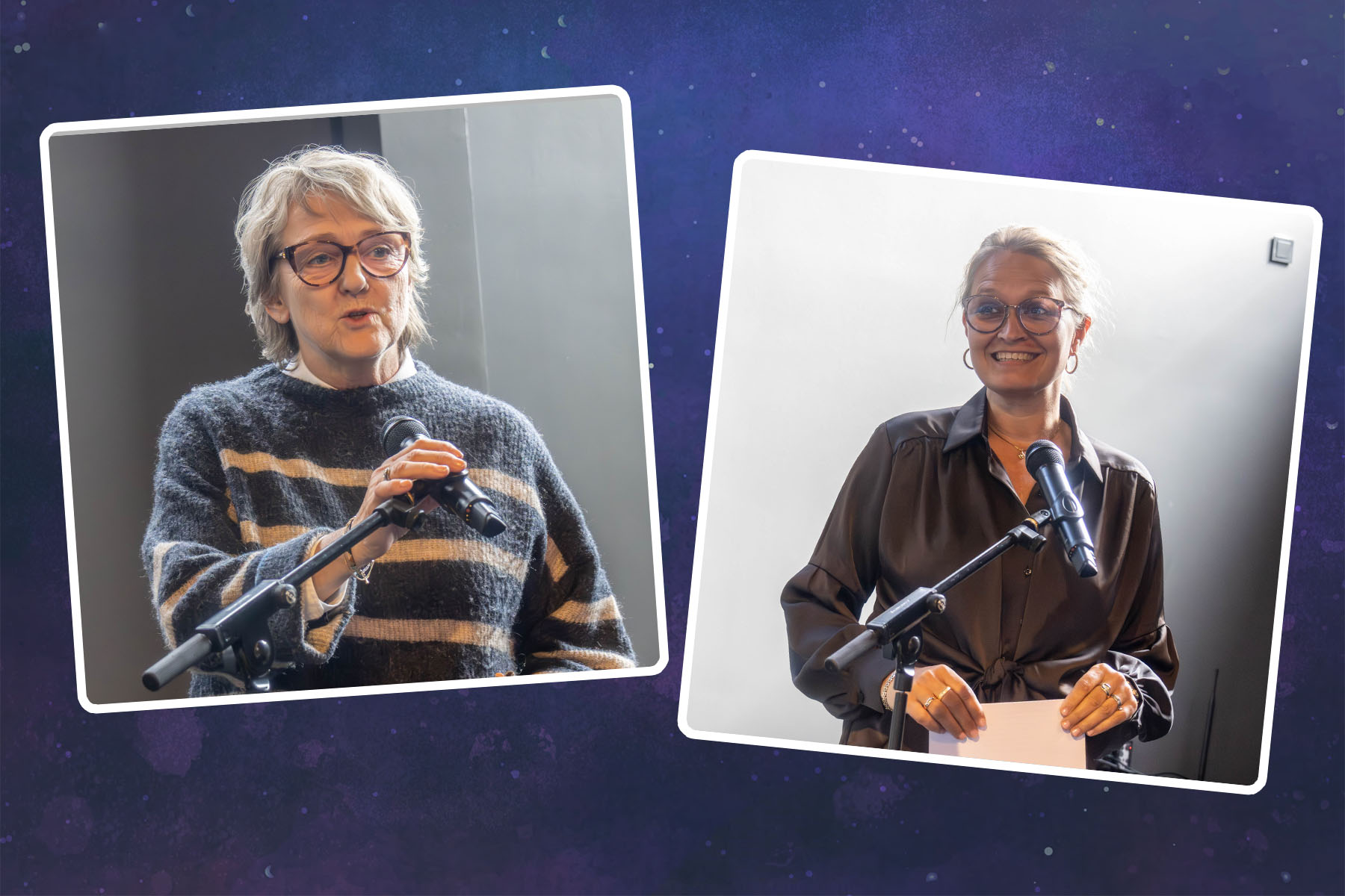 Jette Nielsen, der er formand for Give Udviklingsråd (tv.) og Maiken Nørtoft, der udtalte sig på vegne af Give Handel & Erhverv, udtrykte begge stor taknemmelighed overfor Skulpturby Give i forhold til, at foreningen har skabt liv i byen og en større tiltrækningskraft til butikkerne og i forhold til nye beboere. Fotocollage: Jim Hoff