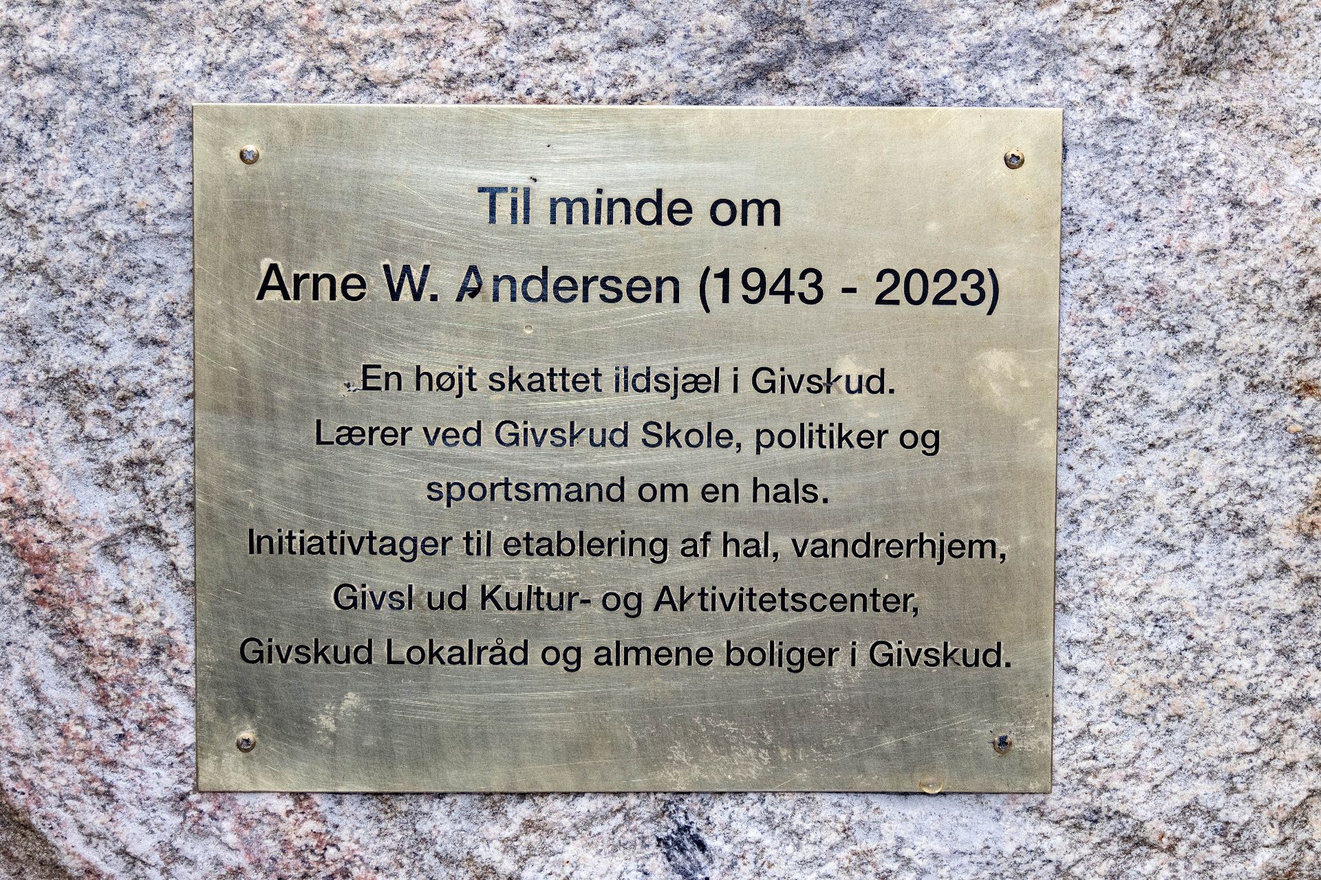 Til minde om Arne W. Andersen 1943-2023. En højt skattet ildsjæl i Givskud. Lærer ved Givskud Skole, politiker og sportsmand om en hals. Initiativtager til etablering af hal, vandrehjem, Givskud Kultur- og Aktivitetscenter, Givskud Lokalråd og almene boliger i Givskud.