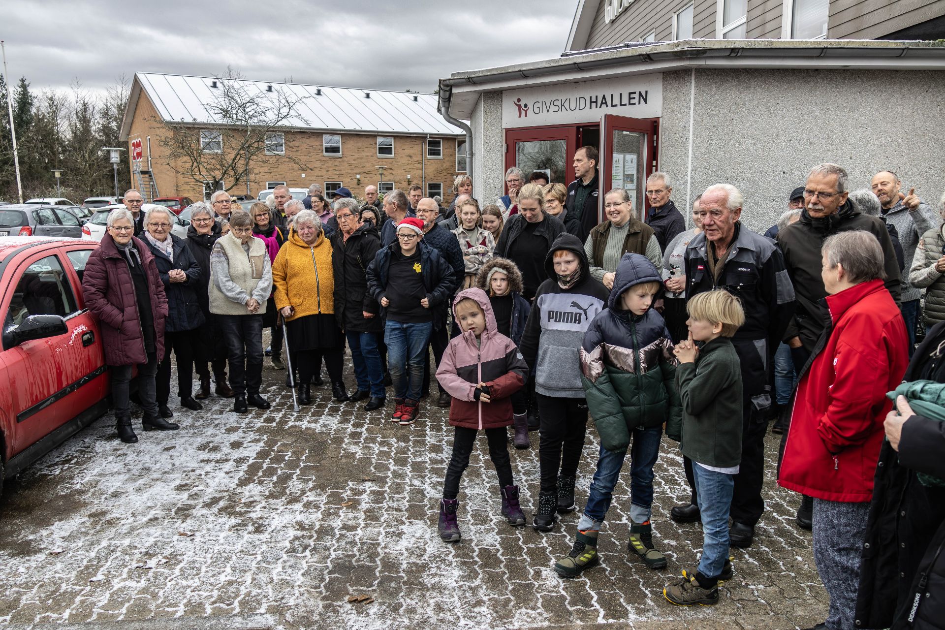 Folk vandrede hjertens ud af hallens varme julehygge for at hylde den lokale ildsjæl Arne Andersen. Foto: Jim Hoff