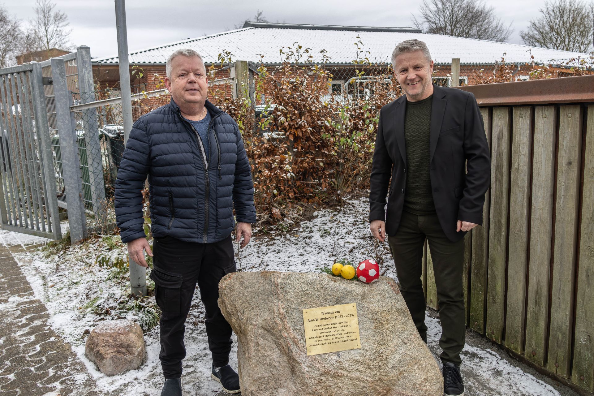 Arne Andersens to sønner Søren og Johnny var på plads, da den fine mindesten over deres fra blev afsløret - og de var ligesom deres mor Bente virkelig stolte og glade over den flotte gestus. Foto: Jim Hoff