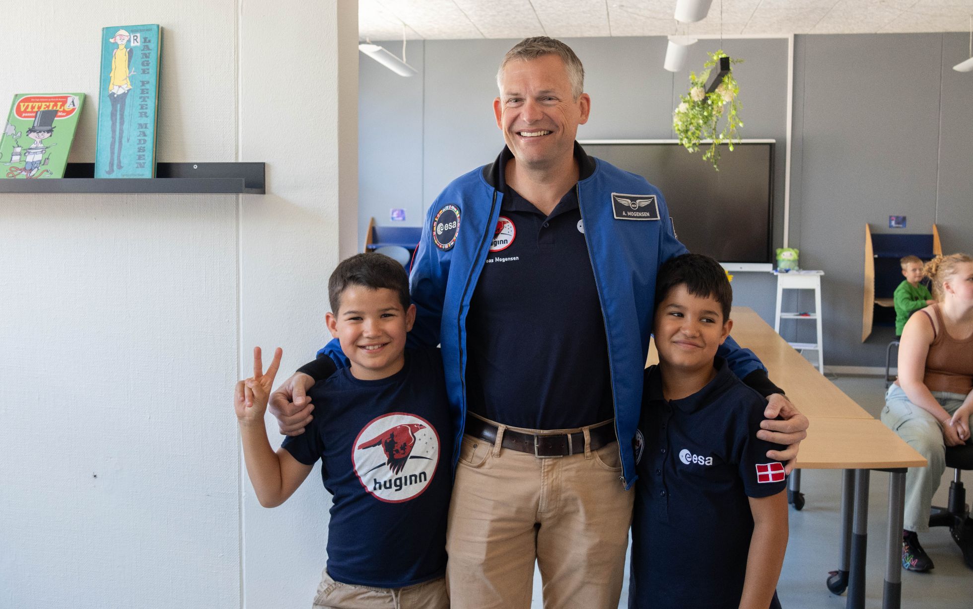 Efter spørgerunden og et velfortjent stående bifald til ‘Stjernemanden’, fik børnene klassevis adgang til en autografrunde med Andreas Mogensen. På jordnær og tålmodig vis fik alle børnene hans opmærksomhed, en autograf og et klistermærke. Med det samme logo, som han havde på sin ESA-jakke.