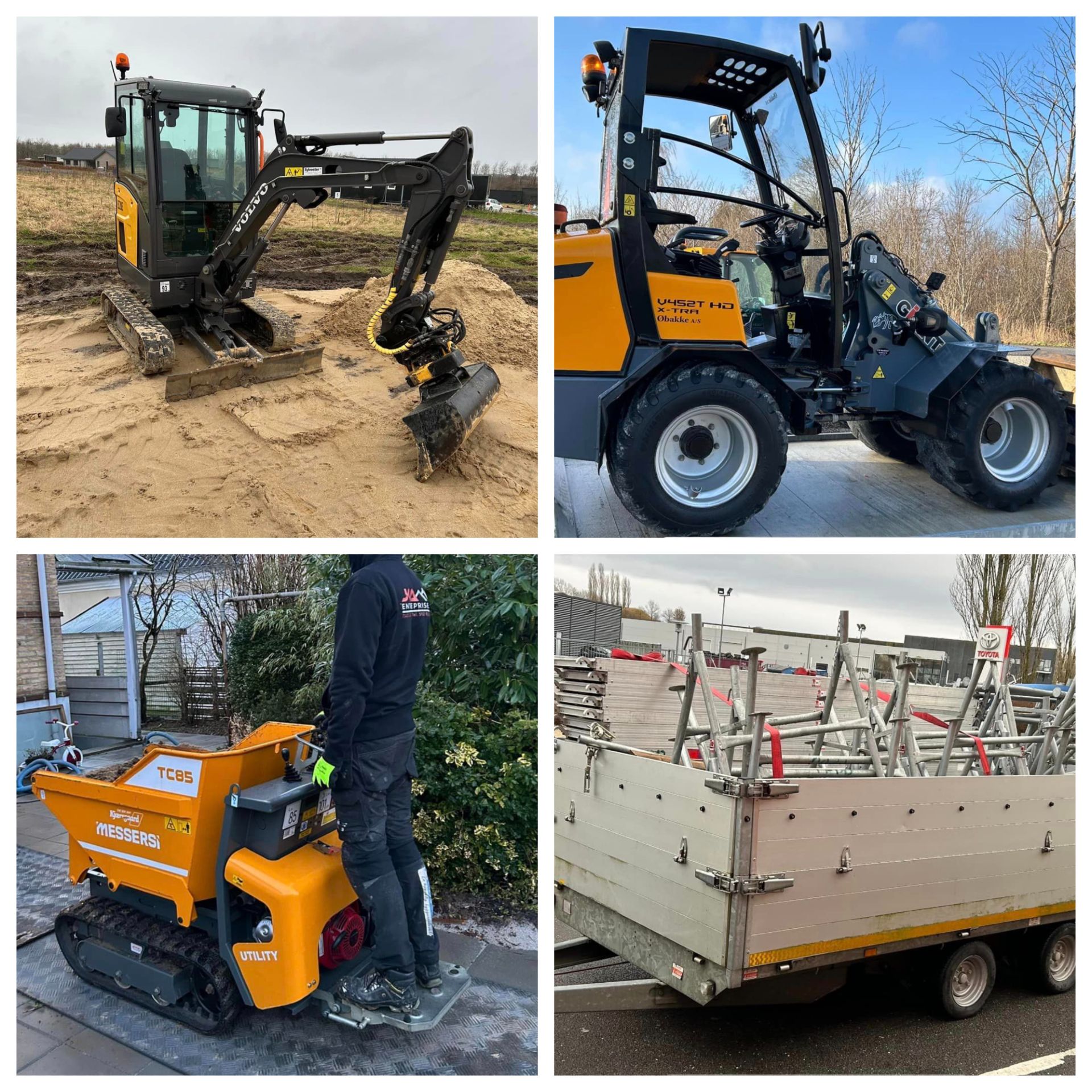- Med hensyn til maskinudlejning fik jeg ideen til at starte det op, da jeg selv oplevede, at man skulle køre rimelig langt for at leje større maskiner. Jeg kunne se et marked for det her i Give, både for private og håndværkere, og indtil videre har vi en fin udlejningsprocent. Vi har mange fine maskiner på plakaten: Tiptrailere, ja vi har stort set alt i trailere, minigravere 1-2-3 tons, minilæsser (en lille gummiged), betonblander, stillads, rullestillads, plastikkøreplader og håndværktøj som eksempelvis betonhamre og meget mere. Man kan se vores beholdning af maskiner på JKA Entreprise på Facebook, siger Jonas.