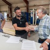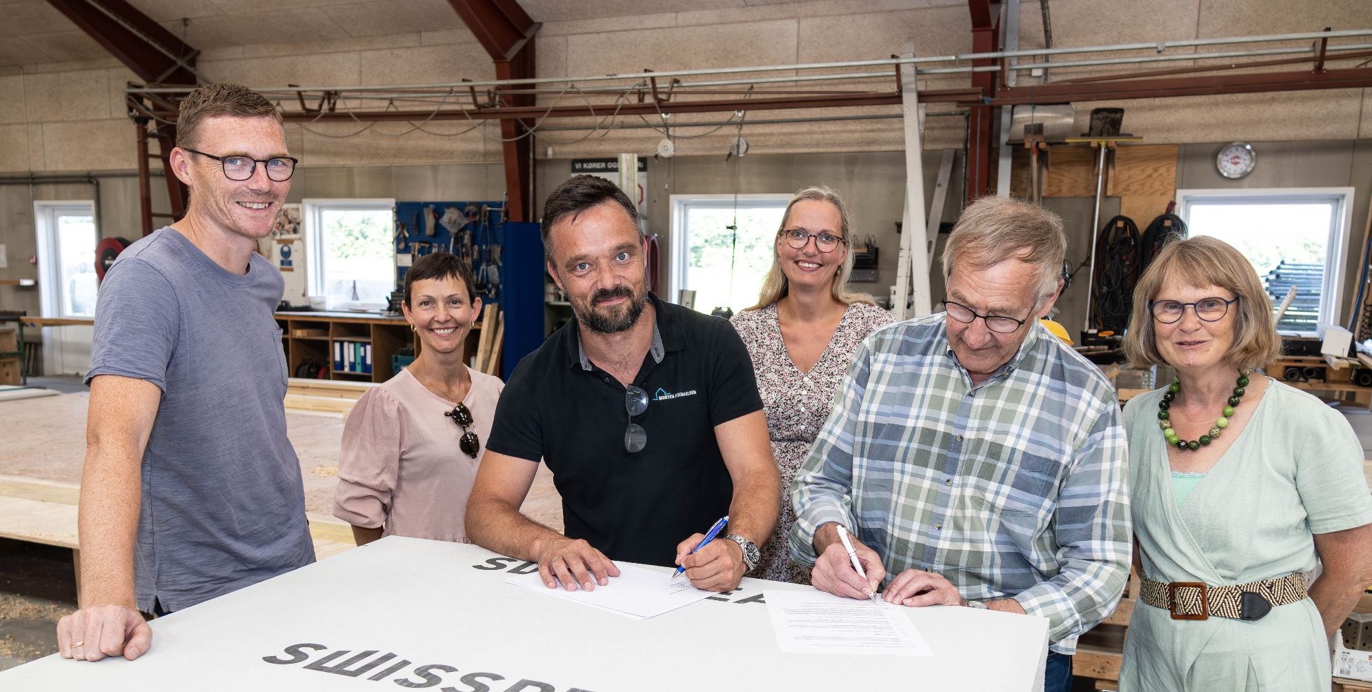 DEN GODE ERHVERVSHISTORIE: Det var en rigtig fin dag for Søren Peder Sørensen og hans hustru Else torsdag den 15. august. Her kunne Søren Peder nemlig sætte sin underskrift på en salgsaftale med tømrermester Morten Michaelsen fra Morten Michaelsen ApS med hovedsæde i Uldum, som har købt Harresø Byggeforretning pr. 1. juli 2024.