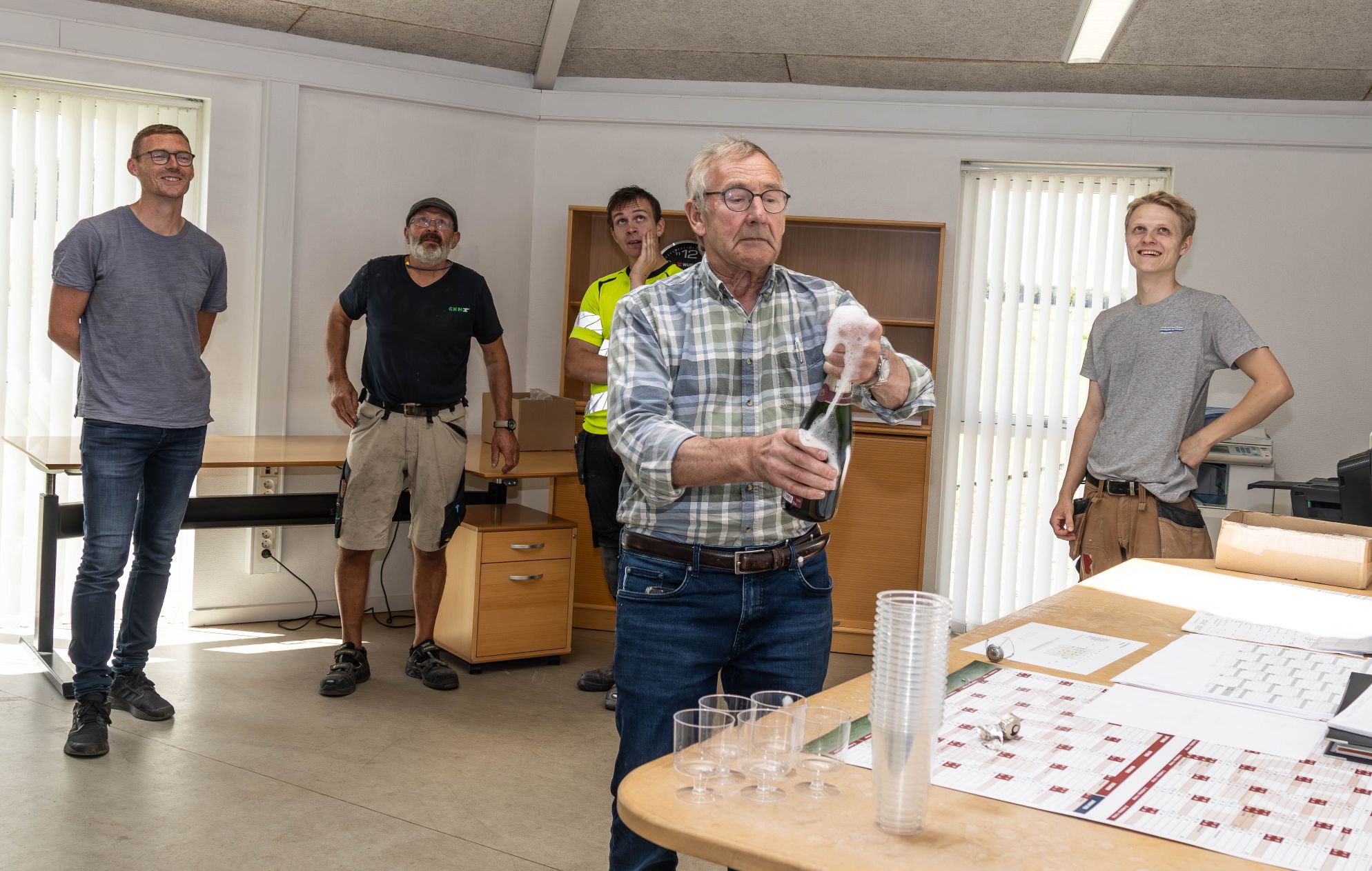 Det er naturligvis mester himself, Søren Peder, der med et knald og flotte skumsprøjt åbner de tre flasker, som dagens tilstedeværende efterfølgende skåler muntert. De tre medarbejdere er naturligvis med i festlighederne.