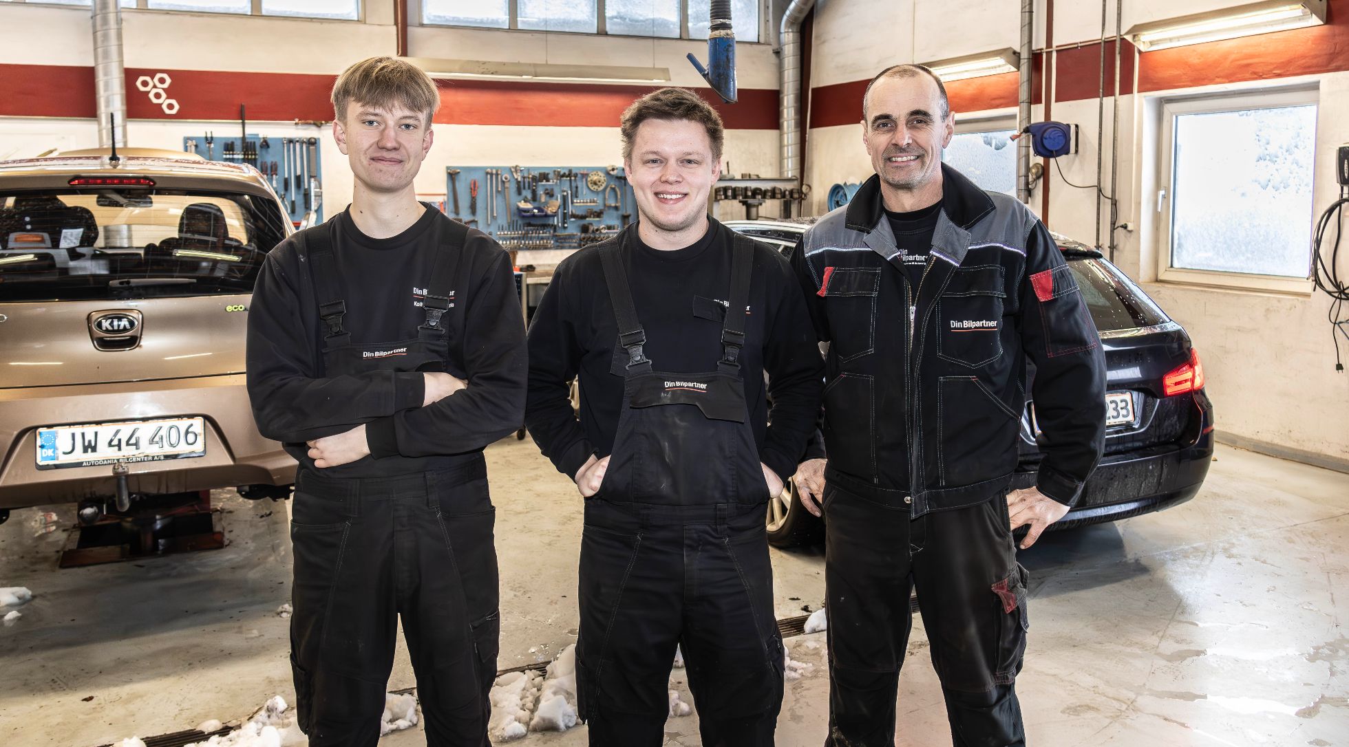 Team Kollemorten Auto består af lærlingen Magnus, indehaver Jonas Overby og mekanikersvend Jan Mortensen. Foto: Jim Hoff
