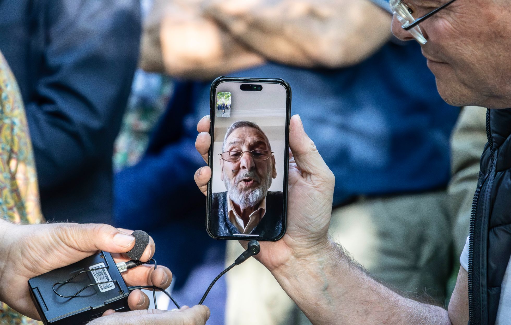 David Whiting, der er søn af en af de dræbte besætningsmedlemmer fra LL Lancaster 950, holdt en rigtig fin tale til folket i Vesterlund via Facetime fra Portugal. Foto: Jim Hoff