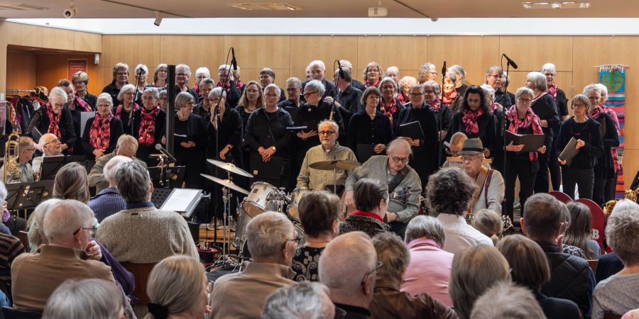 Foto: Der var i alt 116 gæster på plads, da Museum Give inviterede ind til musikdag med Old Boys Big Band, Kurts Kor og Give Egnskor. Disse tre musikalske stillede med i alt 73 personer, så der var godt fyldt op i fællessalen på museet. Foto: Jim Hoff