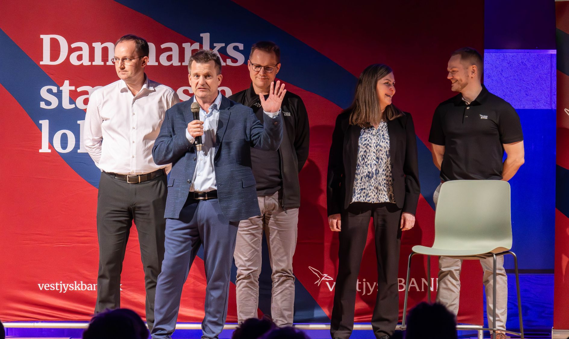 Det var de fem lokale afdelinger af Vestjysk Bank i Give, Billund, Grindsted, Brande og Skjern/Ølgod, der sammen stod for eventen. Her de fem filialdirektører på scenen. Foto: Jim Hoff