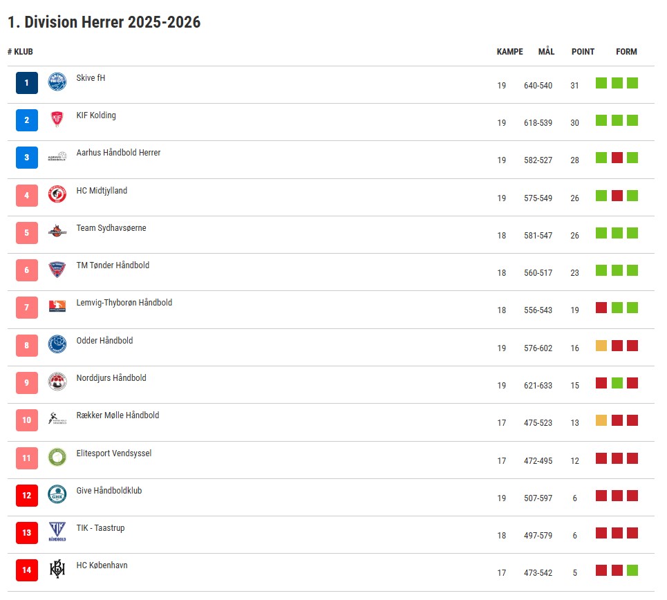 Give spiller næste gang lørdag den 7. februar klokken 15.00 hjemme i Vestjysk Bank Arena mod Lemvig-Thyborøn, der ligger midt i rækken med 19 points for 18 kampe og som dermed ikke er i fare for at rykke ned eller op for den sags skyld.
