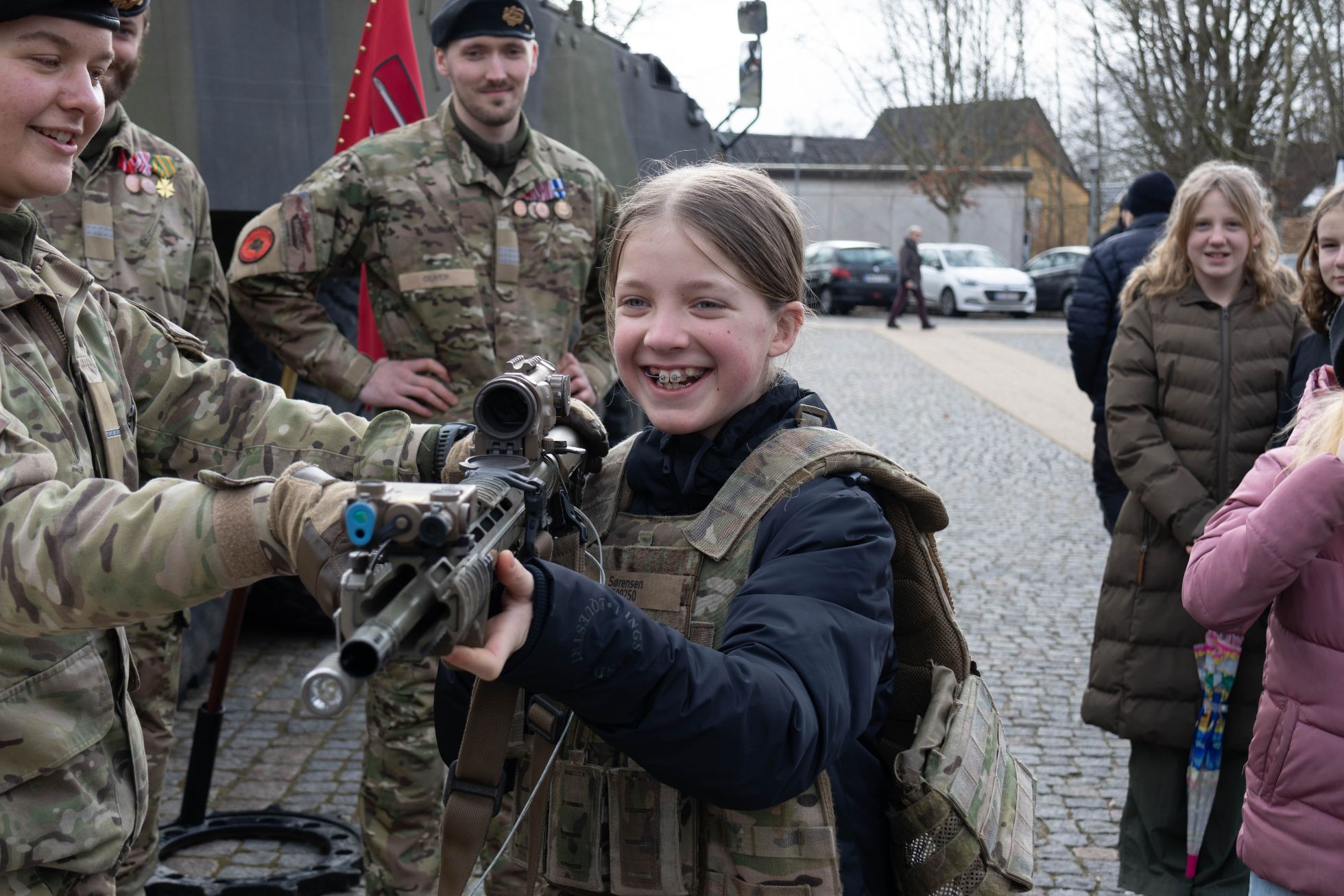 Efter stilheden var der så ’storm’, for her kunne både børn og voksne borgere komme tæt på, og ind i og op på de to tanks/kampvogne, der var linet op på p-pladsen ved Coop 365 og på Bøgetorvet. Der var udstilling af geværer (naturligvis uden ammunition) og skudsikre veste, som man også kunne afprøve, og de jyske landsoldater var også på plads med en række sjove og historisk orienterede aktiviteter – og det foregik alt sammen i den herligste fremkomst af sæsonens første rigtige forårssol.