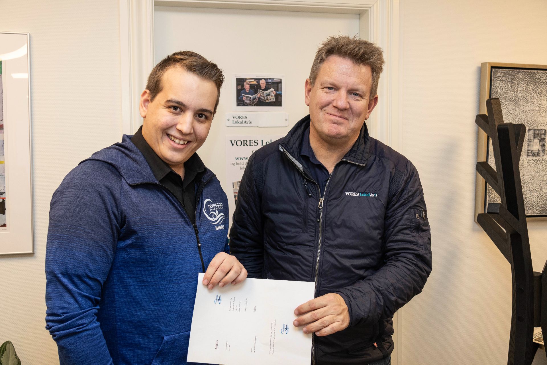 Vores LokalAvis’ direktør og salgschef Søren Grunnet overrækker her præmien på de 2000 kroner til sekretær Mathias Arico fra Thyregod Svømmeklub. Foto: Jim Hoff