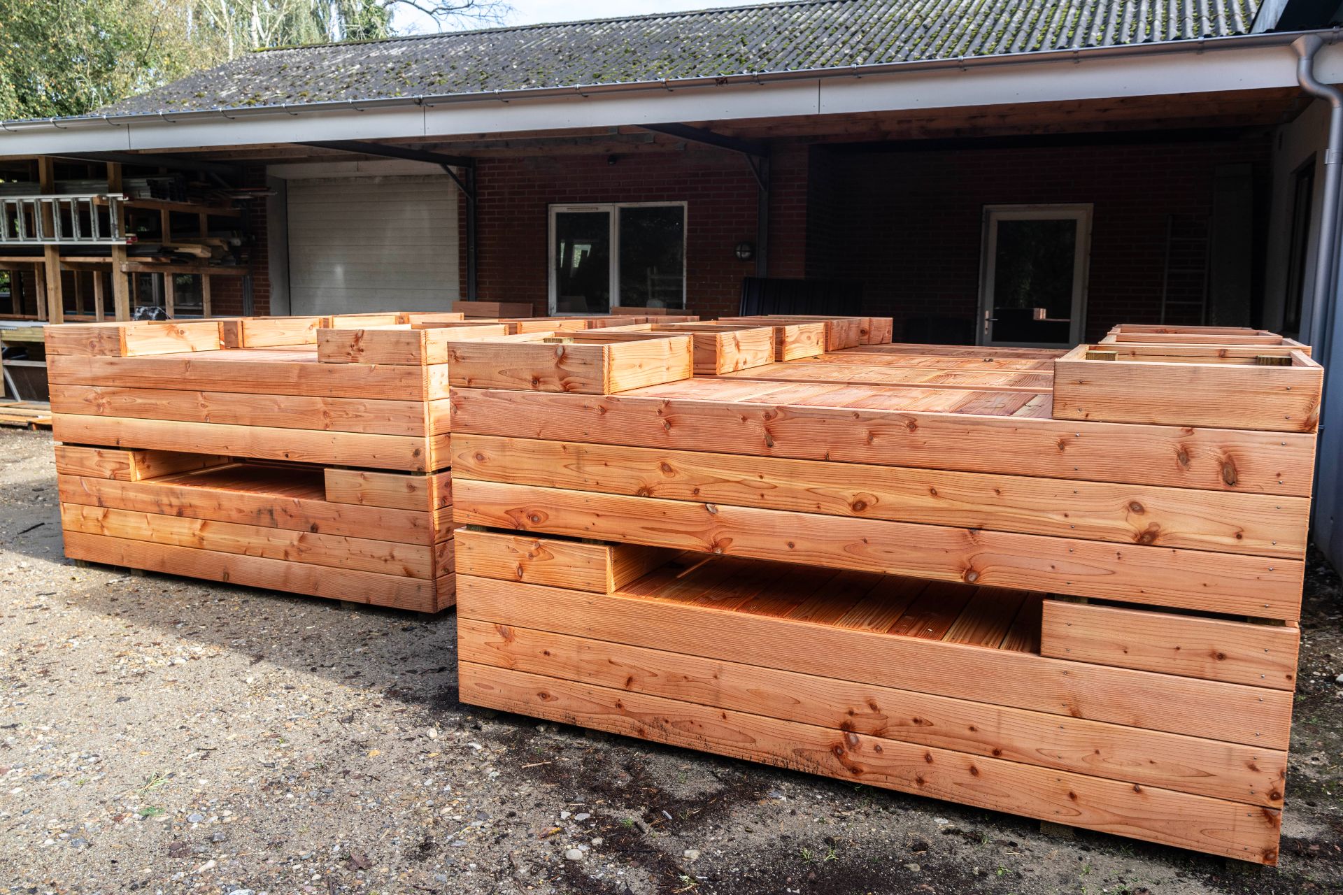 - Det var for stor en ordre, og egentlig er jeg også mere til de lidt mindre ordrer, hvor det også handler om god personlig kontakt og service. Og så igen det der med, at folk godt kan gå med en fin ide med et godt stykke træ, som de gerne vil have mig til at leve et helt konkret projekt ud af. Den slags opgaver elsker jeg bare, for så tænder ilden i den gamle tømrer, når han får nogle gode kreative opgaver. Senest har jeg lavet 18 træbænke i douglas-gran til Give Handel og Erhverv. Bænkene bliver sat op i uge 41, og dem kan man selvfølgelig sidde på, og i siderne er der lavet kummer til blomster osv., Det bliver spændende at få dem sat op, siger Thomas.