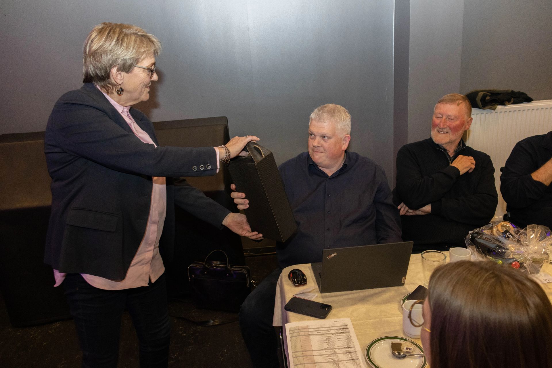 Der var gaver og pæne ord fra formanden til den afgående sekretær Morten Jensen - og aftenens dirigent Arne Brock (th) blev ligeledes begavet. Foto: Jim Hoff