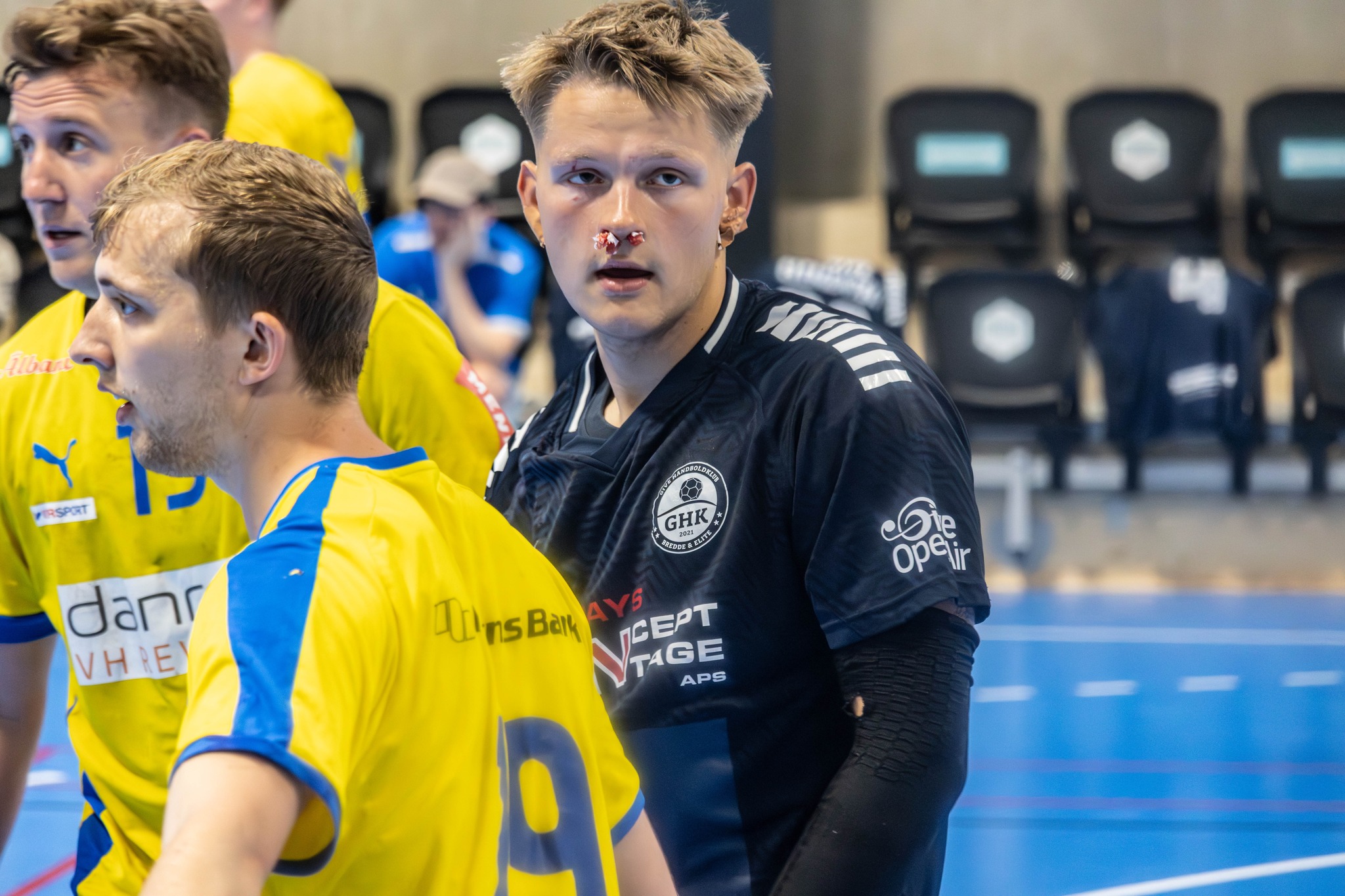 I testkampen mod Otterup brækkede Tobias Kramer næsen - men spillede videre med to totter vat i næseborene. Foto: Jim Hoff