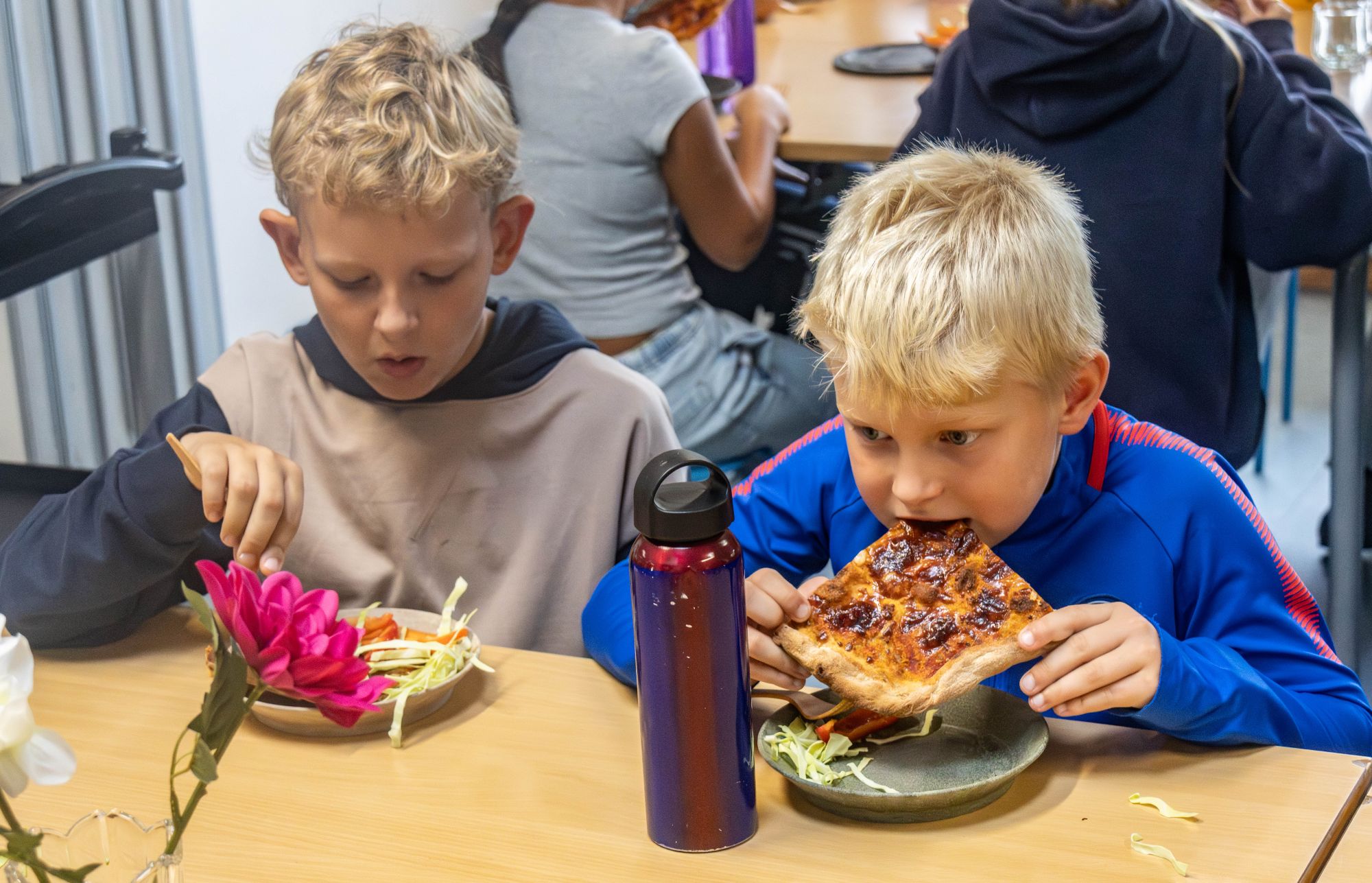 Foto: Mandag i uge 36 var der sæsonpremiere på den nye gratis madordning for eleverne på Karlskov Friskole, og her lagde man ud med en lækker gang surdejspizza med frugt og grønt. Foto: Jim Hoff