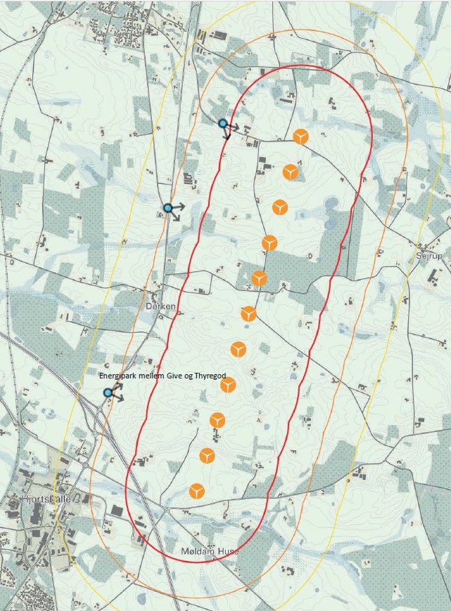 - Overordnet set handler det om at opfylde Danmarks ambitioner om klimamål, og mere lokalt handler det om Vejle Kommunes klimamål. Kommunen har på den konto udpeget 3 lokalområder i forhold til etableringen af energiparker, og her er det ene område altså det bemeldte stykke land mellem Give og Thyregod.