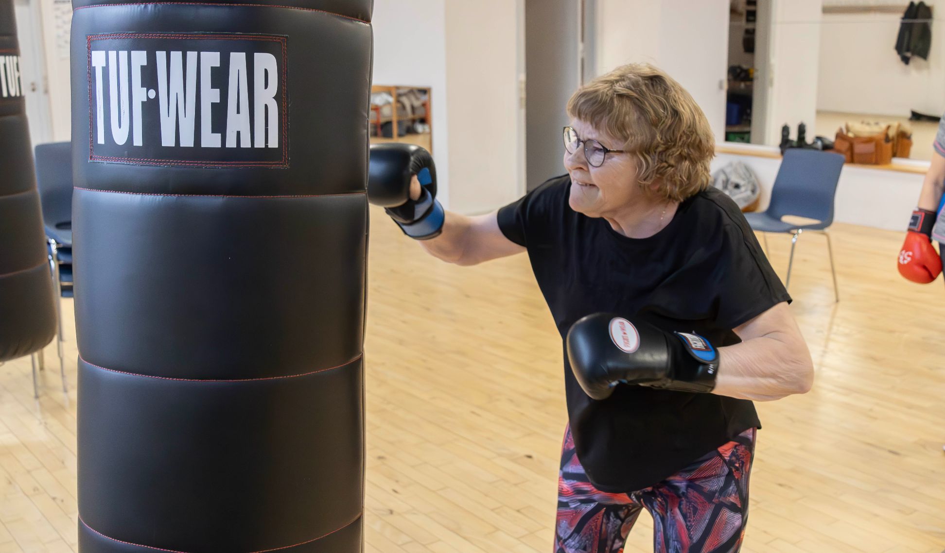 Else Svane tanker både dopamin og god energi, når hun møder op hver tirsdag til boksetræningen. For hende er boksetræningen blevet en uundværlig del i hendes liv. Foto: Jim Hoff