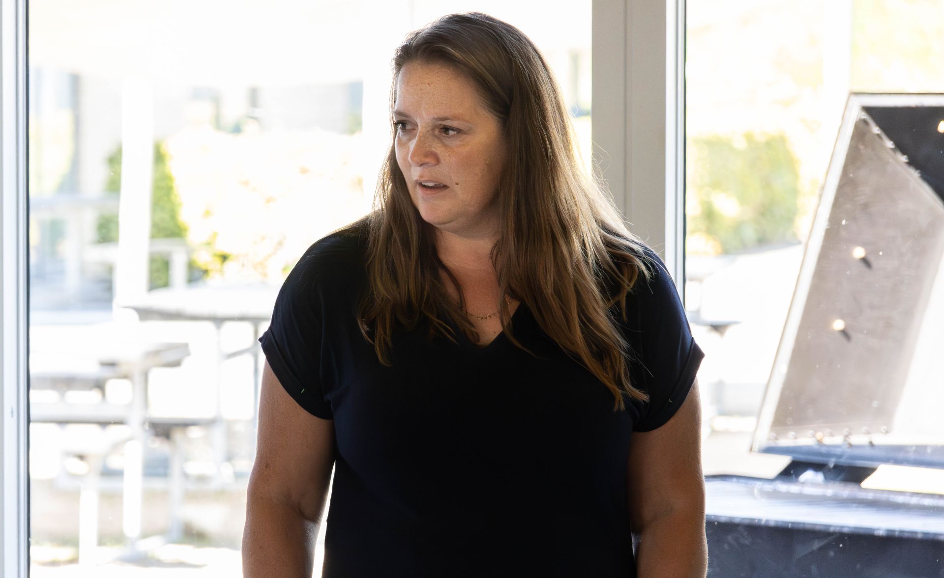 Afdelingsleder Karina Hasselstrøm lagde i sin tale vægt på det stærke fællesskab, der er på og som driver Elkjærskolen - både uden for skolens vægge og indenfor. Foto: Jim Hoff