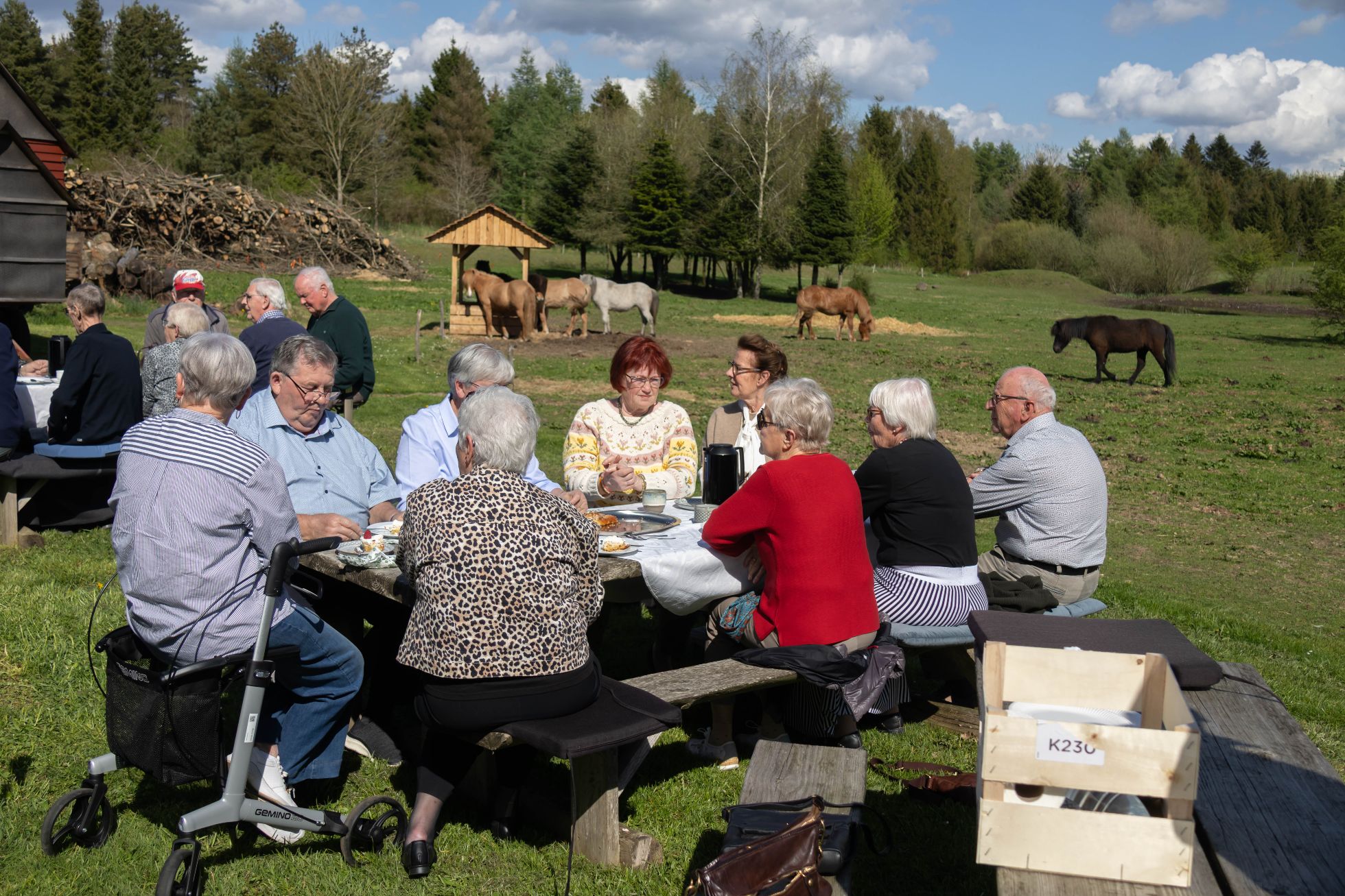 Efter middagen på Restaurant Rørbæk Sø, med de dertil hørende gode snakke om go’e gamle dage og røverhistorier fra klasseværelset og skolegården, gik turen ud til Danakilde og savværket på Rørbækvej 13, hvor Rebecca og Torsten Rye Petersen havde inviteret klassen med påhæng ind til en hyggelig eftermiddagsseance på bænke ude i den frie natur med udsigt til græssende heste.