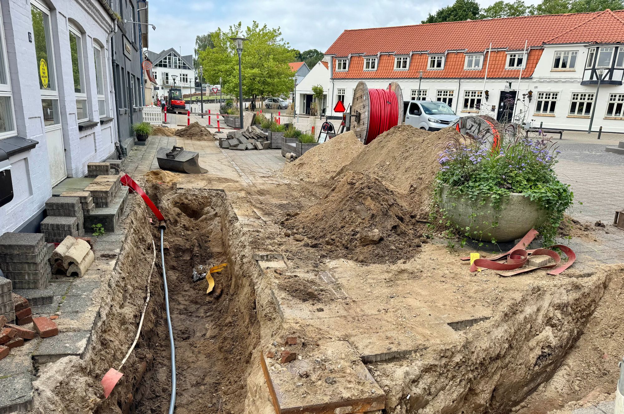 I uge 33-34 har MES været i gang med at etablere nye strømkabler, inden selve renoveringen af Torvet på begyndes. Foto: Jim Hoff