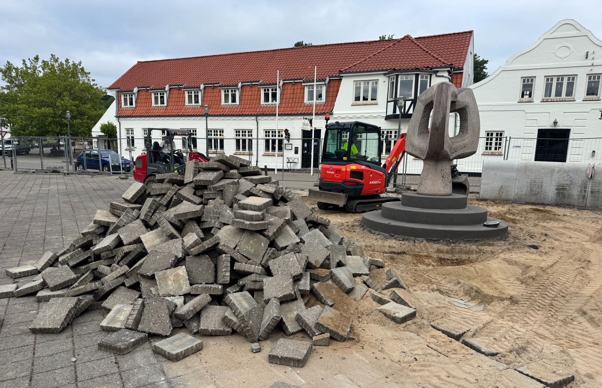 BYUDVIKLING: Mandag den 25. august trillede de første oprydningsmaskiner med dertil hørende håndværkere ved rattet ind på Torvet i Give. Tidlig formiddag gik håndværkerne nemlig i gang med at pille brostenene omkring skulpturen ’Væksttræet’ op – gode genanvendelige brosten, der skal ud at have liv andetsteds i kommunen.