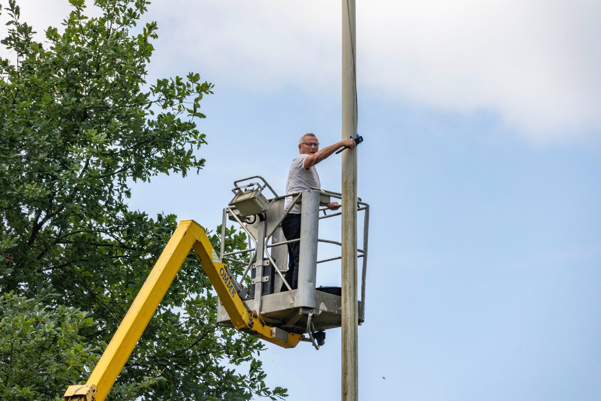 I dagene op til den store jubilæumsfest var der travlhed med at gøre anlægget pænt og præsentabelt. Her er der Karsten Jensen, der har taget liften op for at rengøre flagstangen. Dagens højdepunkt, tænker vi. Foto: Jim Hoff