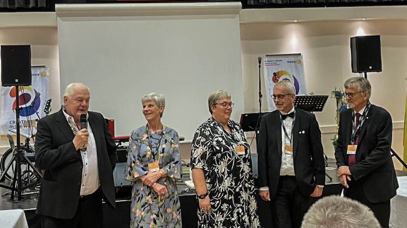 Foto: Repræsentanter fra Give Rotaryklub med ledsager fik en ”guldmedalje” om halsen, da Rotarys distrikt 1450 lørdag holdt distriktskonference i Skjern. Privatfoto
