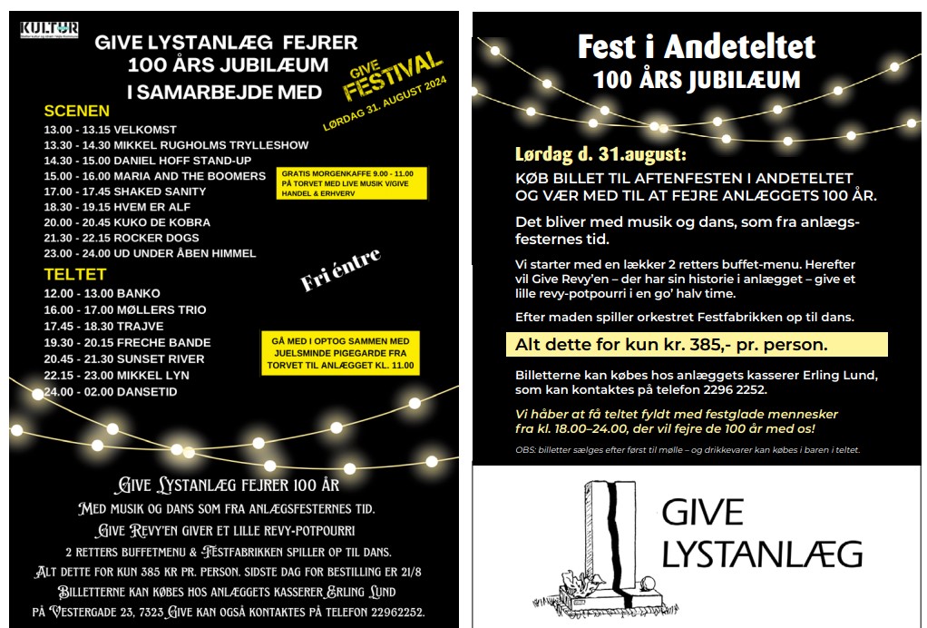GIVE: På lørdag er der i den grad døm byfest og liv ag galde dage, når Give Lystanlæg og Give Festival rent symbolsk ruller den røde løber ud. Der fest i byen fra morgenstunden med gratis kaffe/rundstykker og musik på Torvet, Juelsminde Pigegarde spiller festen op til Give Lystanlæg, der denne dag fejrer 100-års jubilæum med dertil hørende festivitas.