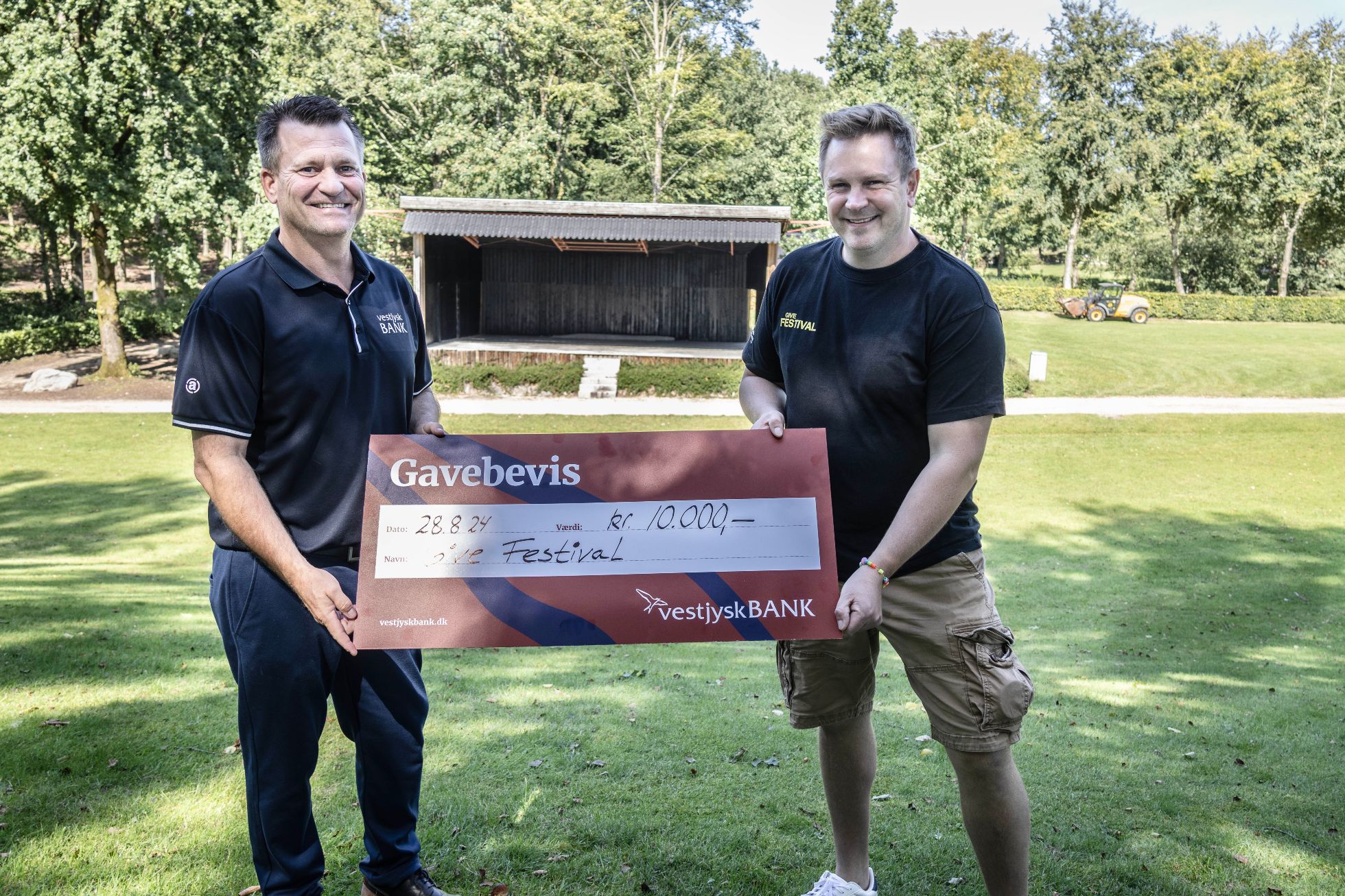Lars Bodholdt fra Vestjysk Bank (tv.) overrækker her den gode check på 10.000 kroner til Thomas Klinke der er næstformand i Give Festival. Foto: Jim Hoff