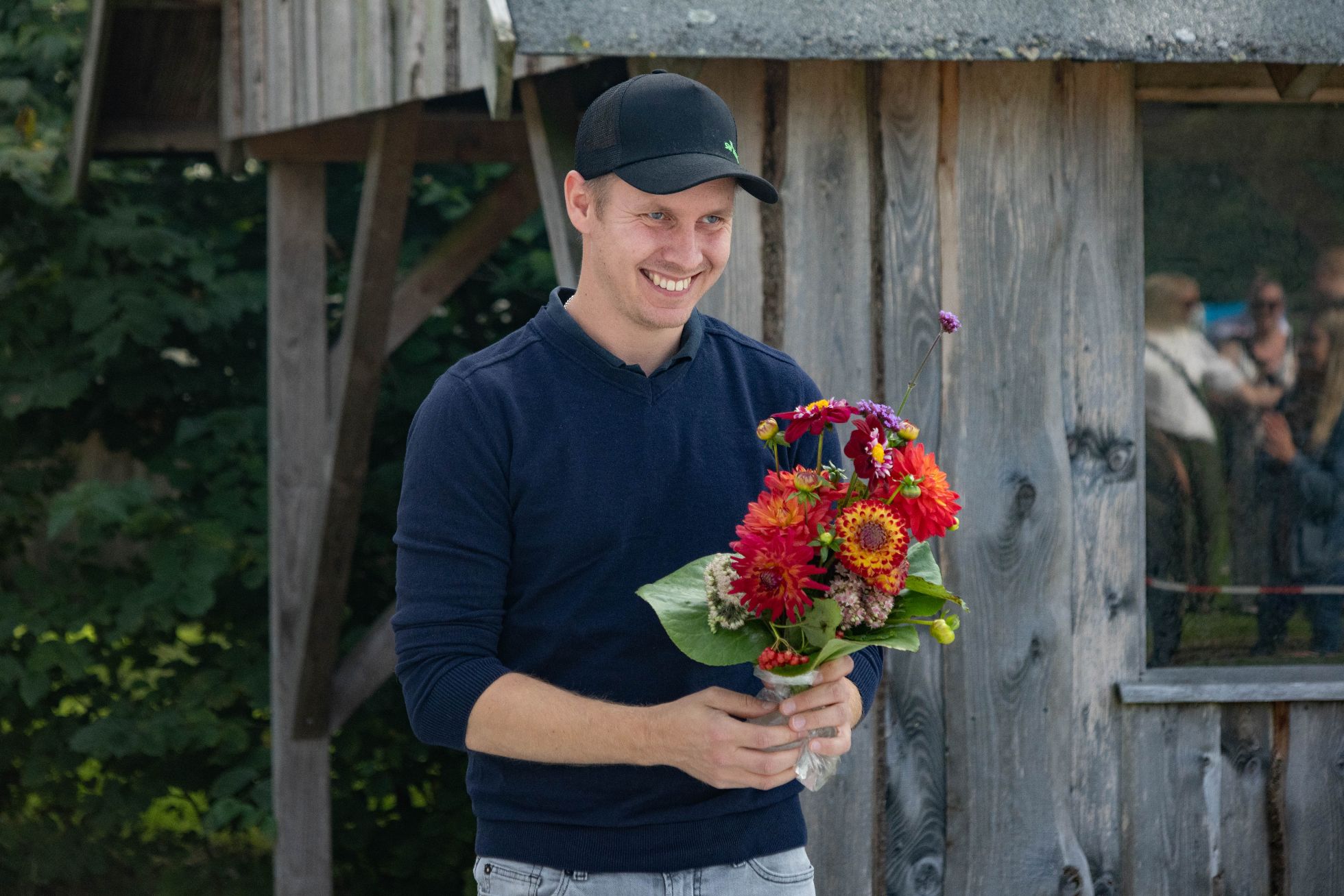 Jeppe Buch Mathisen, der er pedel på skolen i Vonge, fik også blomster for sin vedholdenhed, da det så sortest ud i forhold til at skaffe en byggetilladelse til projektet. Foto: Jim Hoff