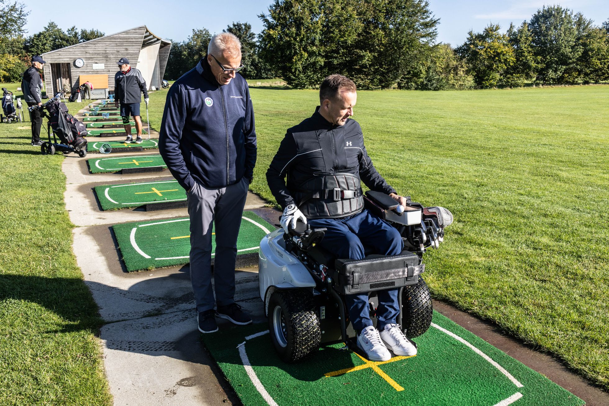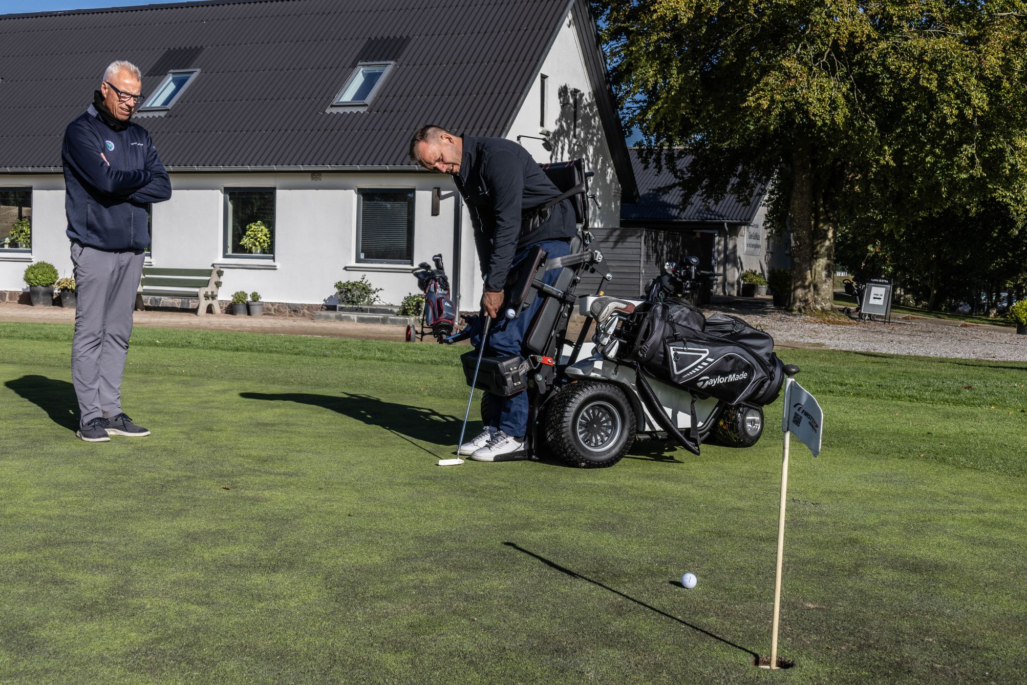 -Fantastisk at det lykkedes for os at skaffe pengene til parascooteren. Det er en 200 kilo tung scooter, der kører 50 kilometer på en opladning med cirka 15 km/t som topfart. Den har kostet 210.000 kroner, og nu mangler vi lige de sidste penge til en trailer til scooteren, så den kan transporteres til kampe i andre golfklubber, fortæller Jesper, mens han gør klar til at slå ud på klubbens driving range.