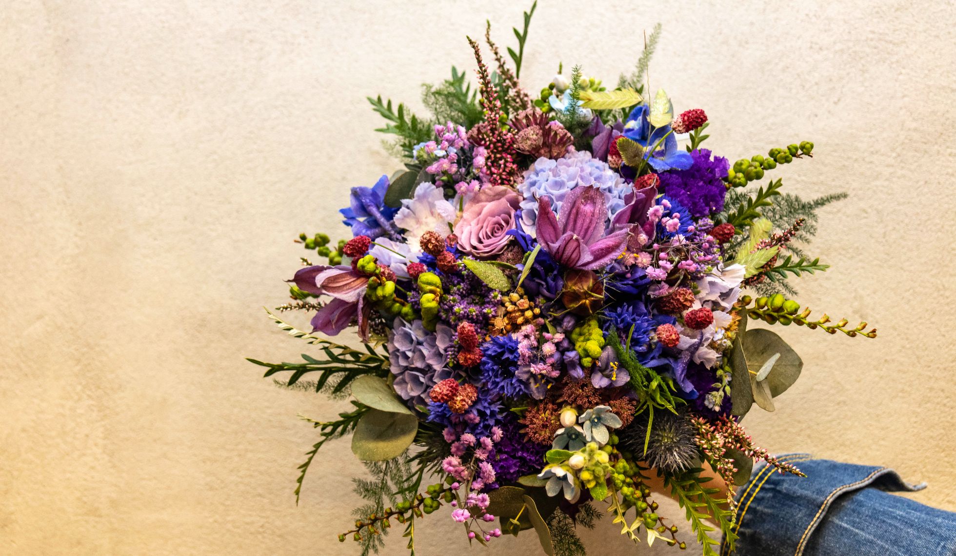 - Jeg har taget udgangspunkt i den blå farve i Welcons logo, da det jo er på Welcon, dronningen skal have buketten overrakt. Der et en ‘landlig’, altså naturlig buket, helt nede på jorden, da vi her på egnen jo er ude på landet og meget jordbundne. Der er for eksempel kornblomster, lyng, hortensia og forskellige græsser i buketten, fortæller Lise.