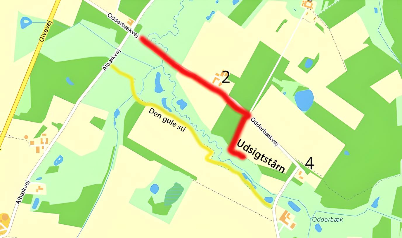 Det er her vi finder det nye udsigtstårn ved Odderbækken. Tæt på den gule sti mellem Odderbækvej 2 og 4. Kort: Krak