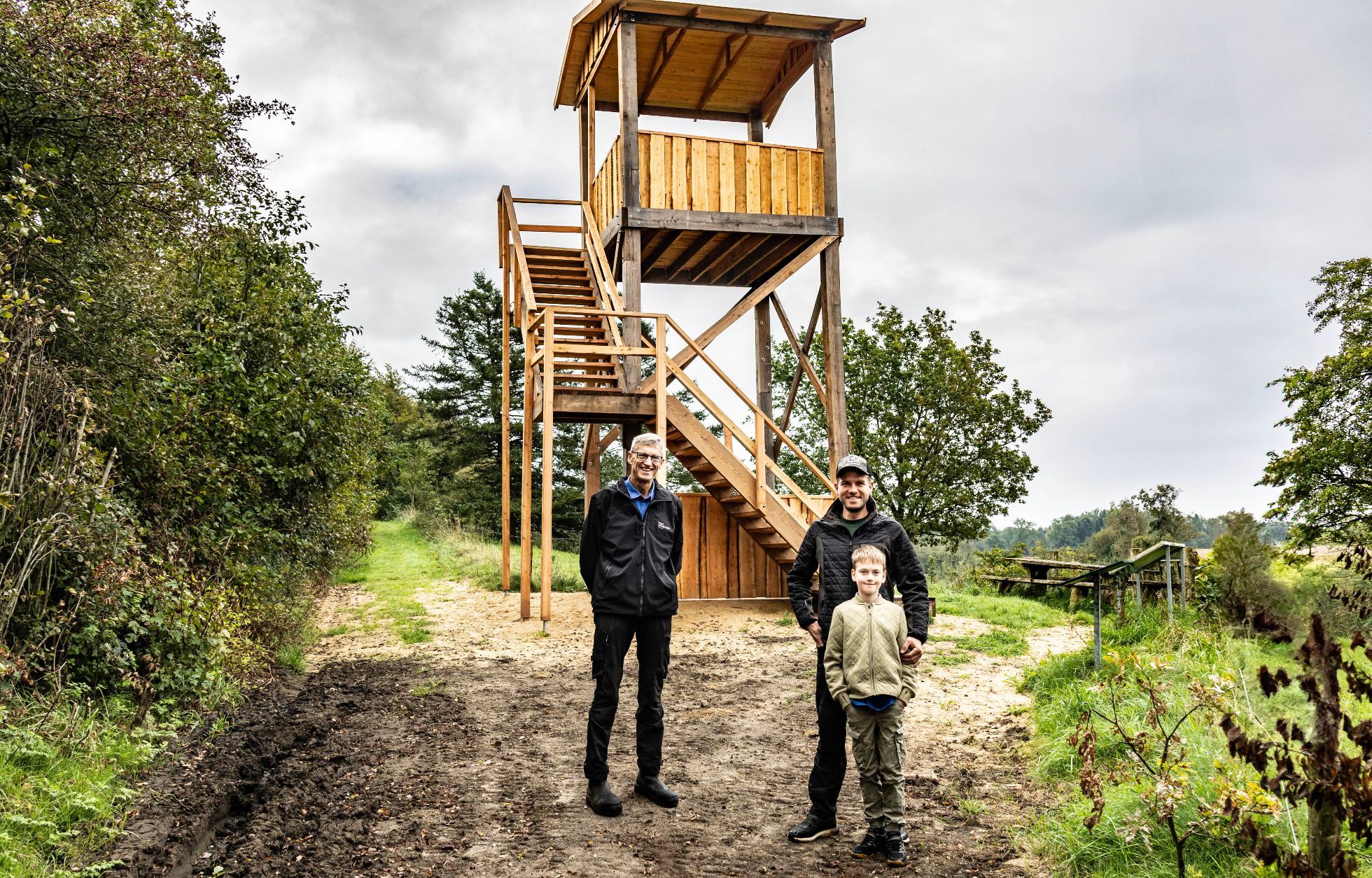 - Vi etablerer også en plads nedenunder tårnet med bænke og borde, hvor man kan sidde i læ for blæst og regn, og det står klar til indvielsen den 29. september, lyder det samstemmende fra Niels og Kristian, mens en dybt benovet Mads får øje på en kongefalk, der lige flyder forbi og hilser på i de højere luftlag.