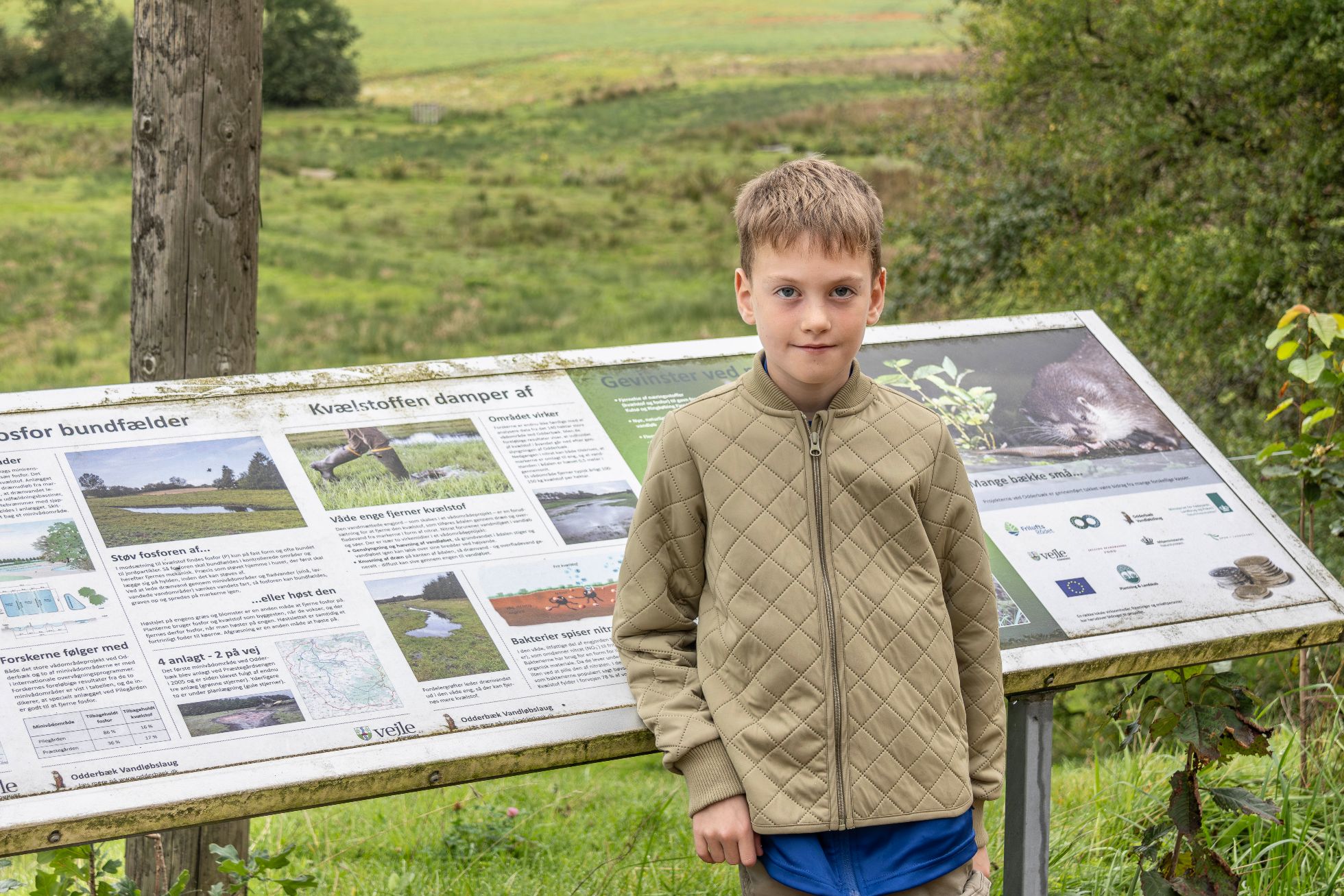 Kristians søn, Mads, var med på turen ude ved udsigtstårnet, og han viser her de plancher, man kan læse om naturen ude ved Odderbækken. Foto: Jim Hoff