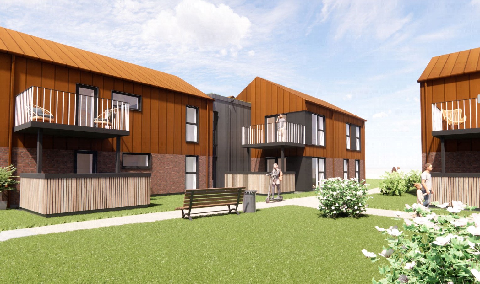 - De grønne tage med sedum samt de rødbrune ståltage understreger det bæredygtige fokus, mens træbeklædte facader og troldtektlofter bidrager til et naturligt og harmonisk udtryk – både ude og inde. Der etableres parkeringspladser, som passer godt ind i området, og hver lejlighed får tilknyttet sit eget depotrum eller skur på ca. 3,5 m².