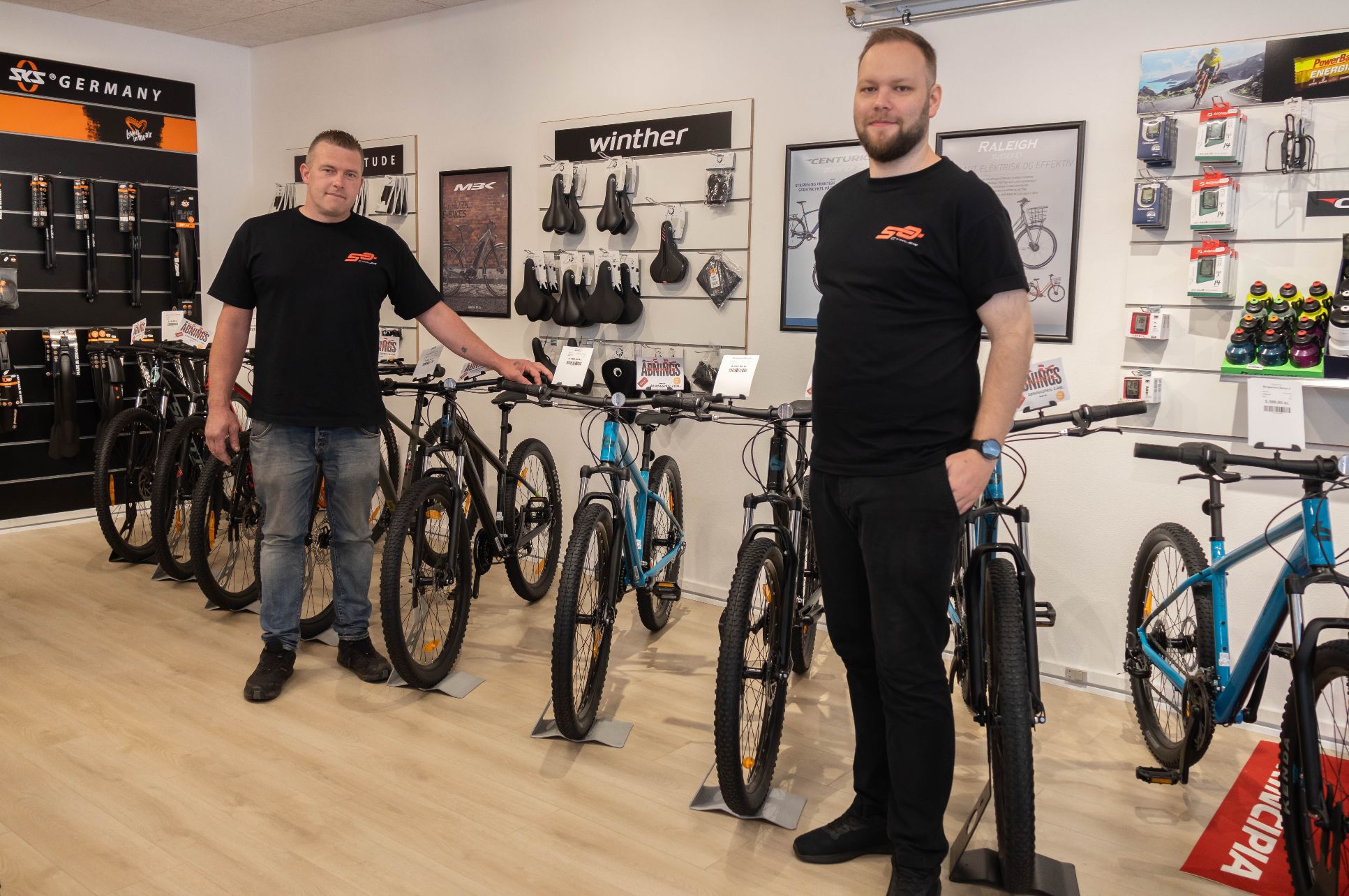 Søren Østergaard (tv.) og Dennis Thorsted holdt reception i lørdags i anledning af åbningen af SØ Cykler i Østergade. Der var rigtig fin opbakning til eventen, idet mange kiggede forbi til en snak, en grillpølse og en kold øl/sodavang - og et kig på den fine butik. Foto: Jim Hoff