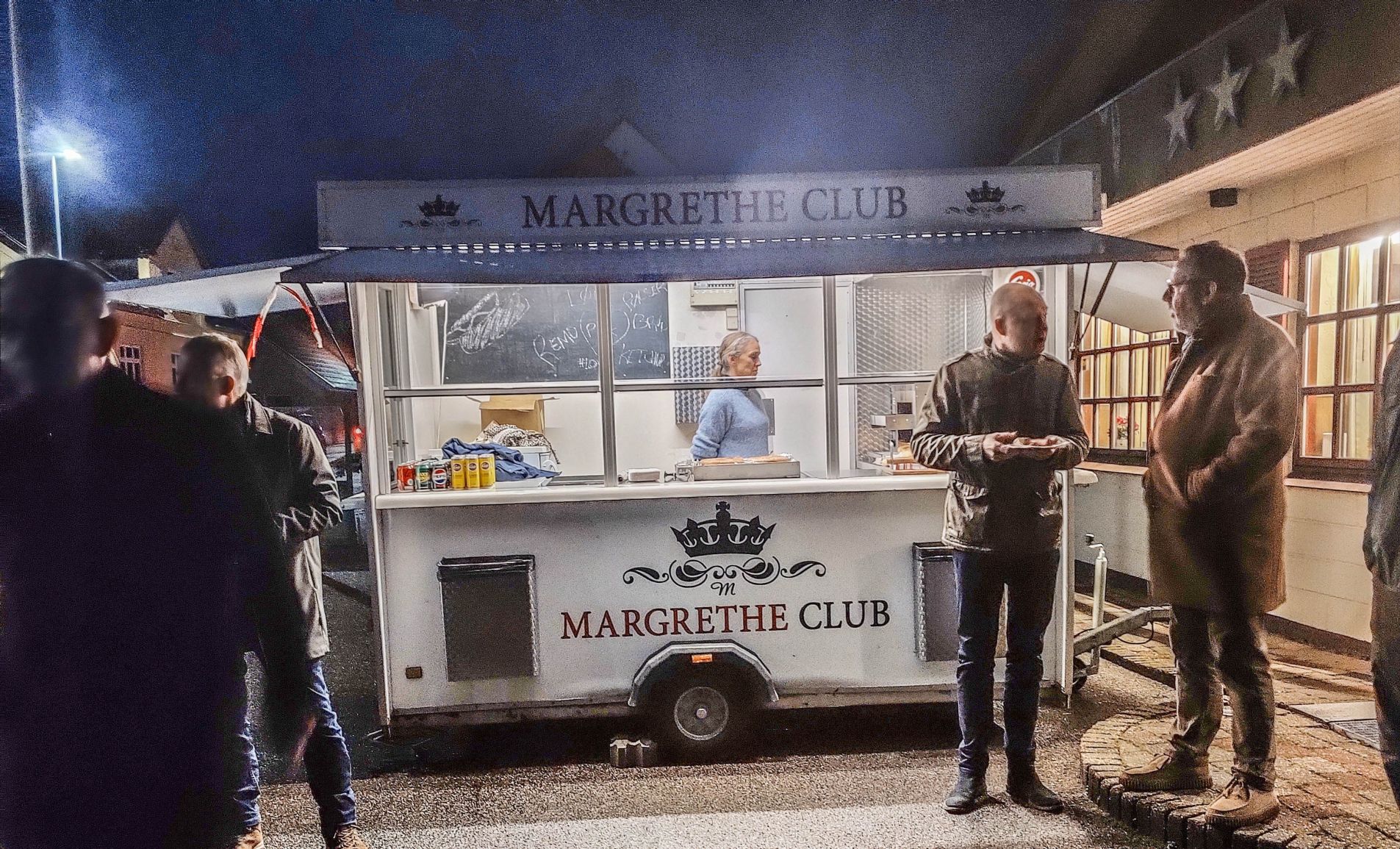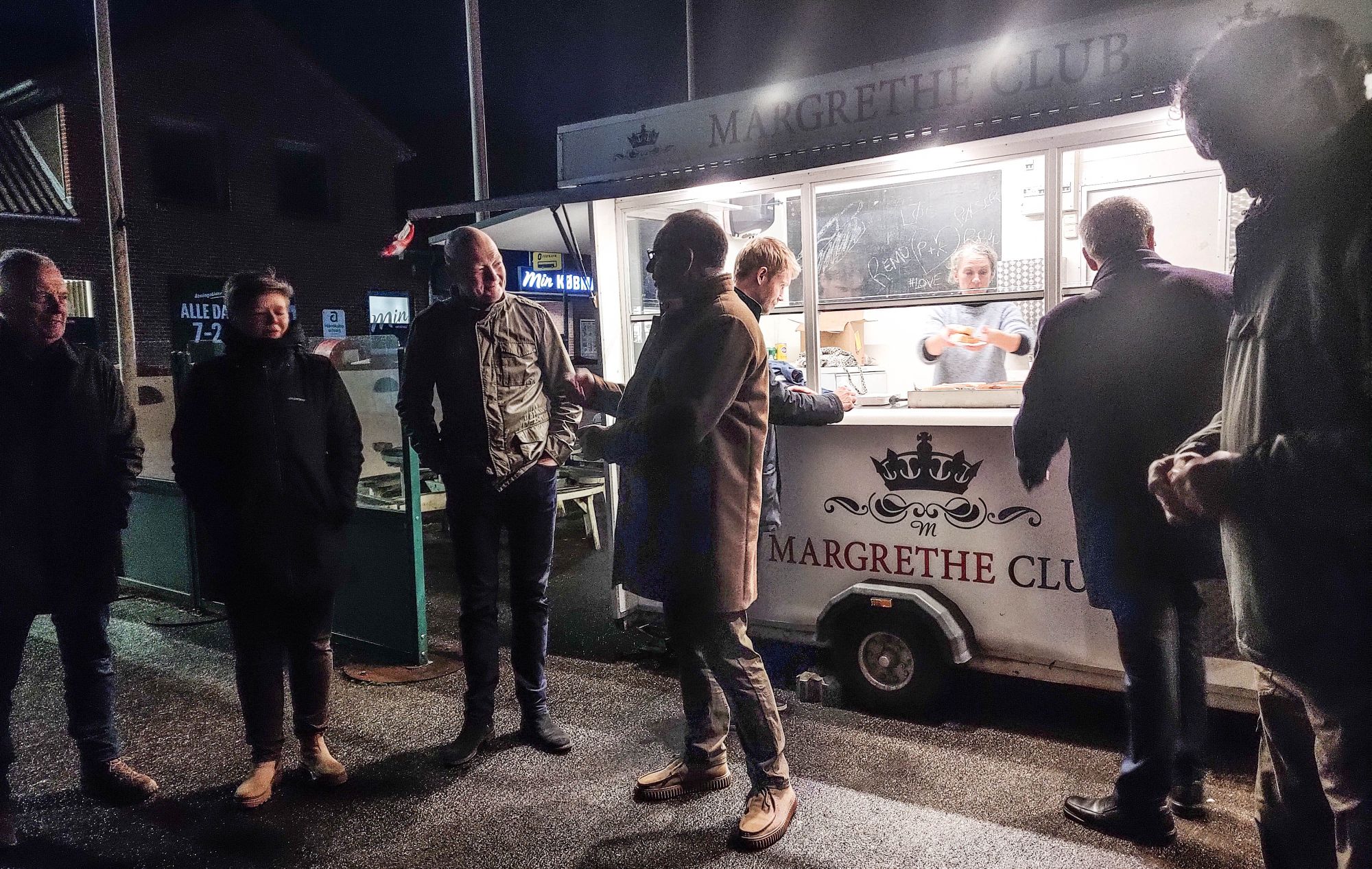 GADBJERG: De initiativrige indbyggere i Gadbjerg, som har for vane at tænke alternativt, havde allieret sig med Margretheklubbens pølsevogn, for at bruge den som lokkemad til de fremmødte politikere. Og det virkede. "En mæt politiker er en glad politiker", udtrykte en veltilpas byrådspolitiker sig, inden mødet fortsatte indendøre, i tilpas afstand fra novembermørkets småregn.
