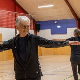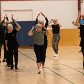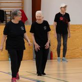 Og så ikke mere snak. Anna kalder folket ud på gulvet, og så går det løs med en række fysiske øvelser til herlig musik af blandt andet Tamra Rosanes, Johnny Reimar, Cliff Richard og to gange Elvis Presley. De sidste strækøvelser udføres til Evis’ smukke version af My Way – helt symbolsk for dette hold, der nemlig gør tingene på deres egen måde, og så rundes opvarmningen af med en spektakulær løbetur i hallen til tonerne af Elvis’ store hit fra 1957, Teddy Bear. Musik fra flere af deltagernes barndom – og det bringer i den grad de bred smil frem sammen med sveden på panden.