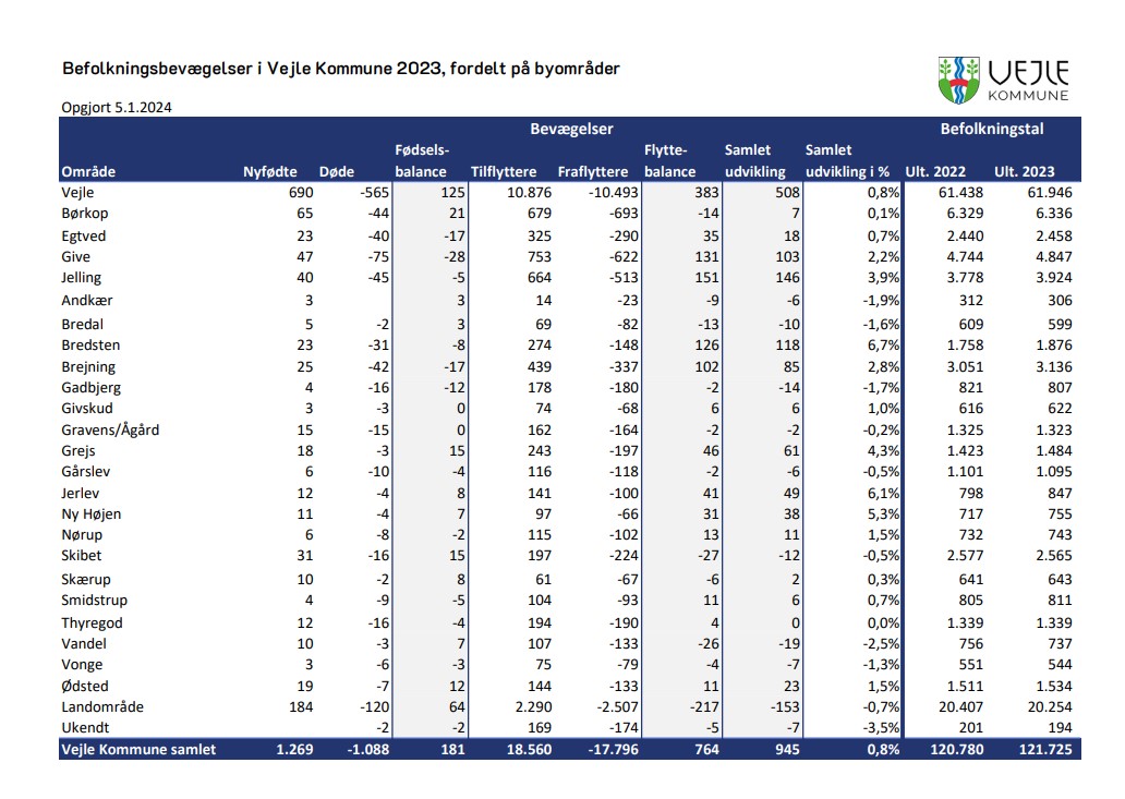 Man kan se tallene for hele kommunen i den vedhæftede tabel fra Vejle Kommune. Kommunen er overordnet set gået frem fra 120.780 indbyggere til 121,725.