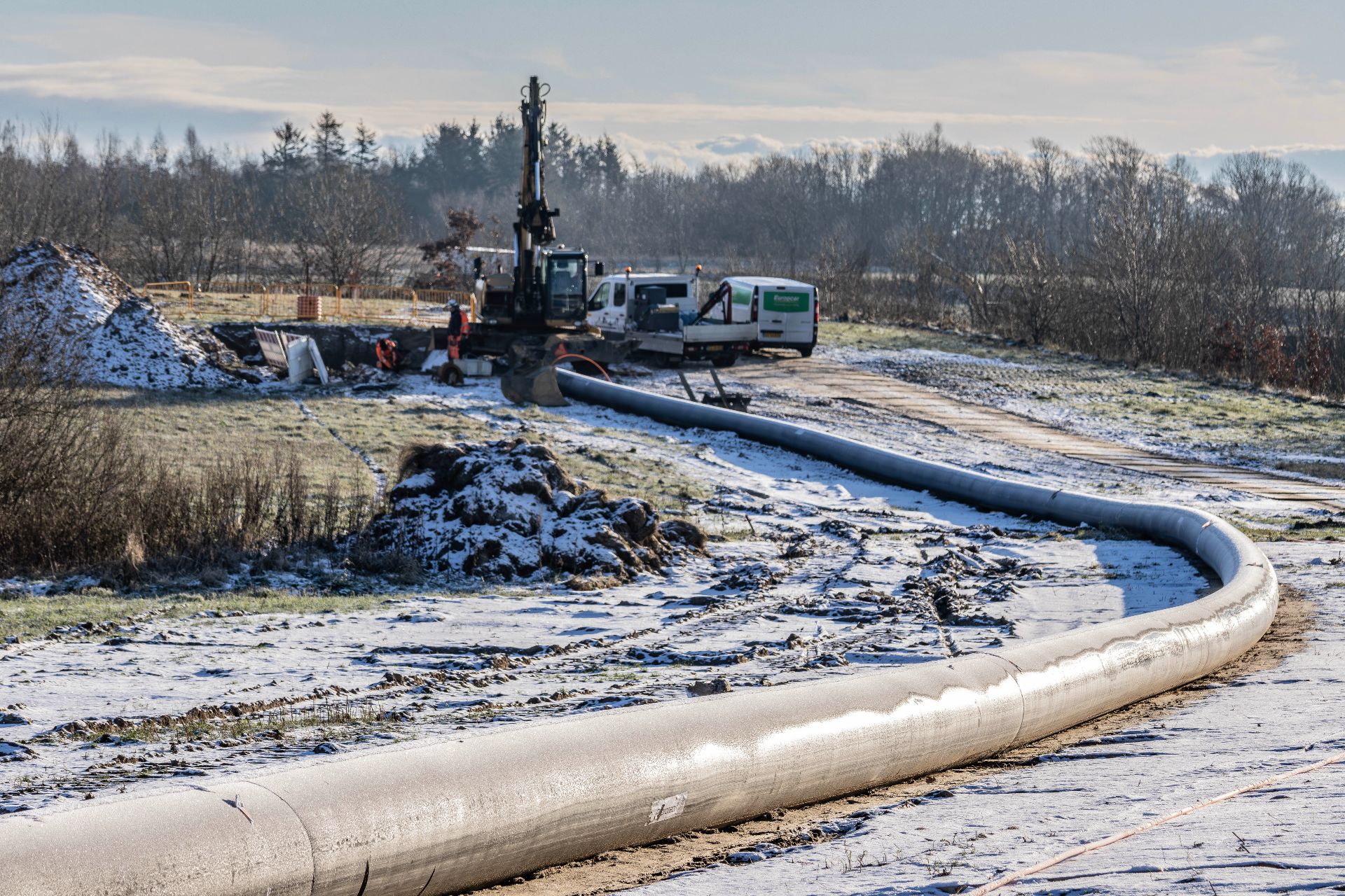 TRAFIK: Der skal transporteres overskudsvarme fra Danpo til Give, og omvendt skal borgerne i Farre have mulighed for at blive koblet på fjernvarmen. Derfor skal der etableres cirka 4 kilometers rørforbindelse mellem Give og Farre, og den opgave er dygtige folk med store maskiner fra entreprenørfirmaet Østergaard A/S allerede godt i gang med at udføre her i det pragtfulde vintervejr.