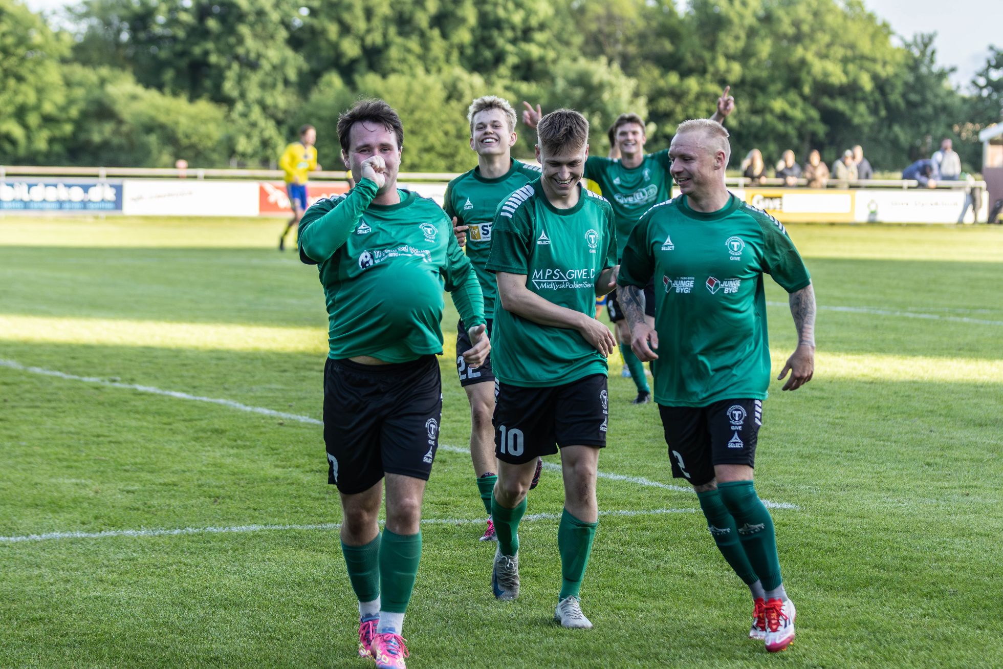 Foto: Kris Larsen scorer her til 2-0 på et flot hovedstød godt sat op af Jonas Østergaard - og scoringen blev efterfølgende fejret med en helt speciel jubelscene. Se foto i artiklen Foto: Jim Hoff